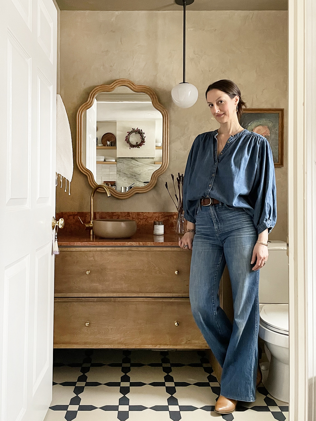 Hennepin Made reached out to me and offered its Lacuna globe pendant light. Because all of the plumbing is skewed to the left of the mirror, I thought it would be cool to hang the fixture to the right, to fill that void. It’s not a bathroom that I do my makeup in, so it didn’t have to be bright. I wanted it to feel more like a hotel.