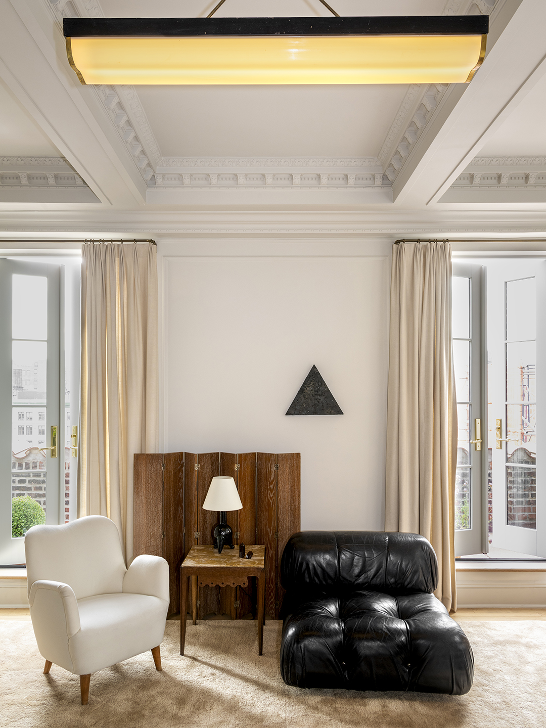 The house before was crisp white and black, and it was really handsome, but I wanted it to feel a little bit softer, a little bit more historic. We chose a chalky bone-colored white paint called Saint Sauvant from Portola. When you use something that’s got a little more depth to it, it shows off all the ornate moldings.