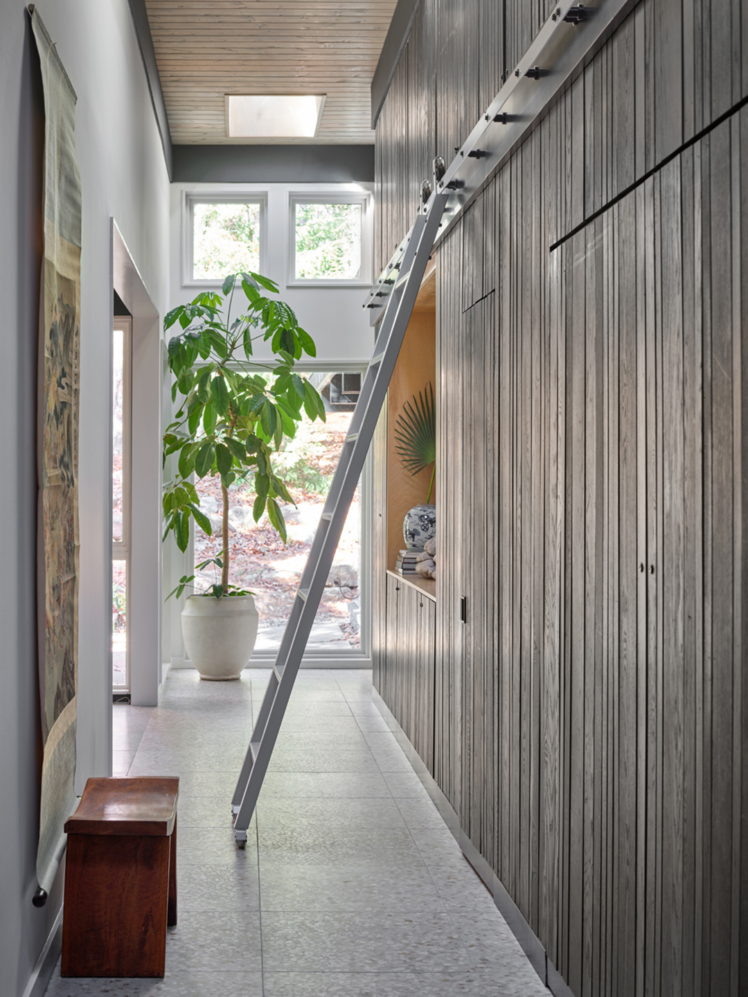 In general, the corridor leading from the main house’s kitchen and dining area into the new guest area is one of the hardest-working spaces we’ve seen in a while. “I wanted to echo the magnolia paneling of the existing home, but knowing I couldn’t match it exactly, I decided to do a wall of V-groove paneling in a black stain that ties back to [it],” says Davis. “It’s a nice nod and really adds great texture while hiding the doors to the various utility spaces.” Speaking of…