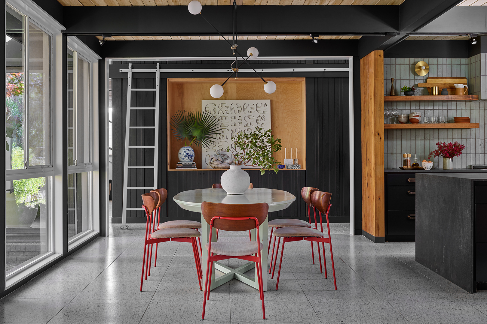 After taking down the garage and building out the new wing—which includes a laundry room, storage, and a powder room; kitchenette; snug; guest bath; guest room; mudroom; and studio space—the mid-century property gained 1,500 square feet of space. Here’s how Davis made it happen.