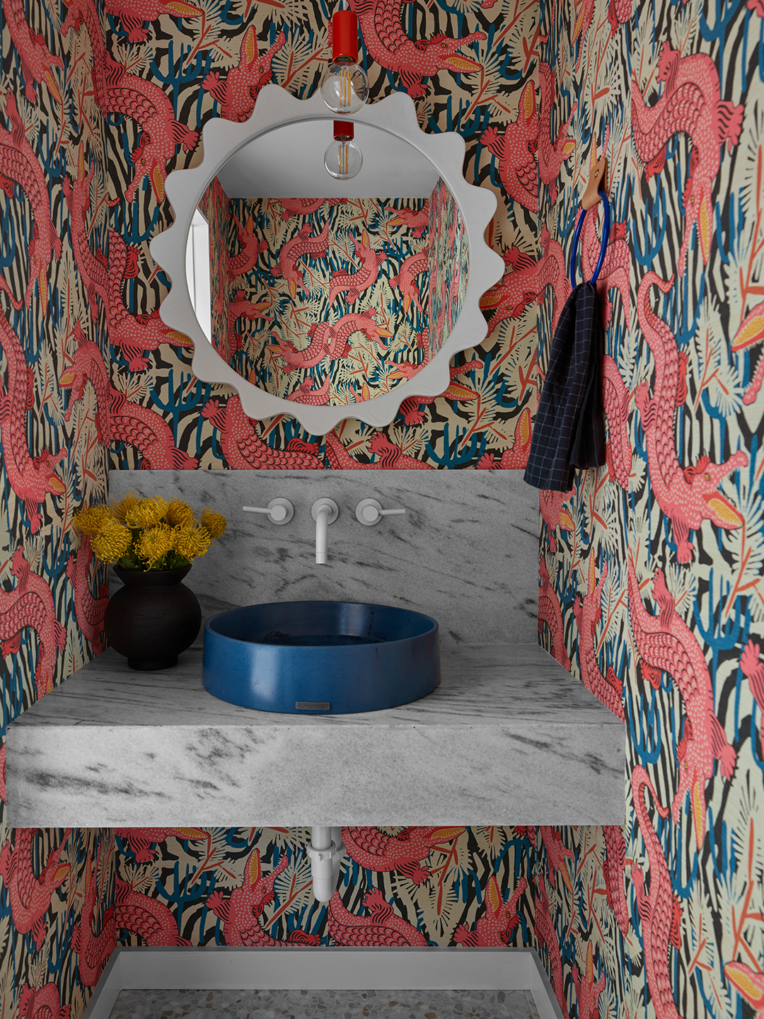 “I love that the laundry and powder rooms are hidden in a paneled wall that is otherwise only punctuated by the plywood niches—one of which functions as a buffet and the other as a command center where we charge our phones, have our calendar, and all of the other junk that collects in family life,” says Davis. “Don’t be afraid to gang together different functions and think of them being unified by something like paneling or a common architectural language.”