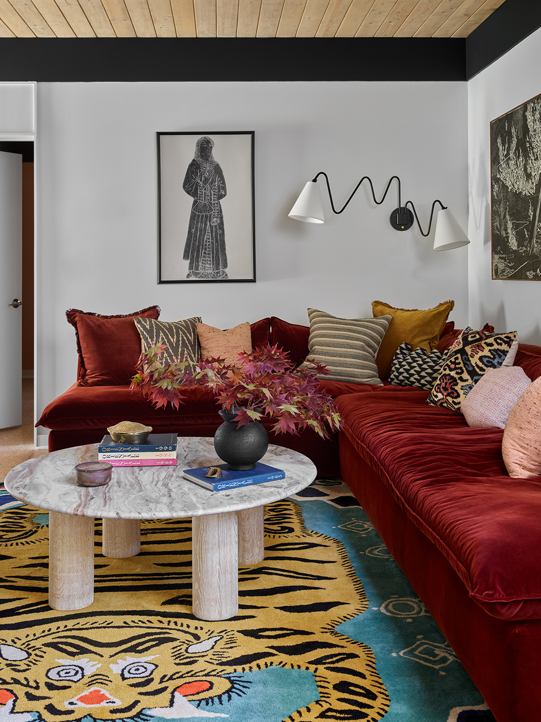 Many of the spaces through the property are big and open. To provide a bit of balance, Davis dedicated space for a snug, a small, intimate area to relax in among cozy furniture. “The custom sectional is superloungy and soft, and everything is considered for a moody, warm TV-watching or reading space,” she says.