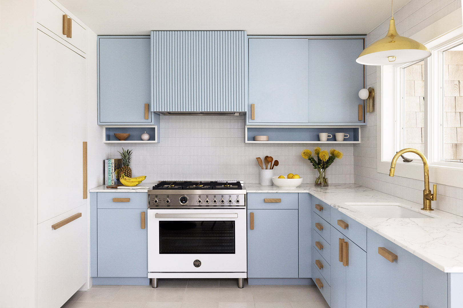 Before embarking on the remodel, Singer took a pulse check. “I was seeing the design world go through a dark green kitchen phase, and I thought sky blue might be on the horizon,” she says. The idea was sealed when she spotted the Ganni founders’ Copenhagen home on the Internet—it’s practically dripping in shades of baby blue. What if the hue veers into trendy territory one day? The creative admits it doesn’t really bother her, “but I don’t necessarily think it has at this point,” she adds.