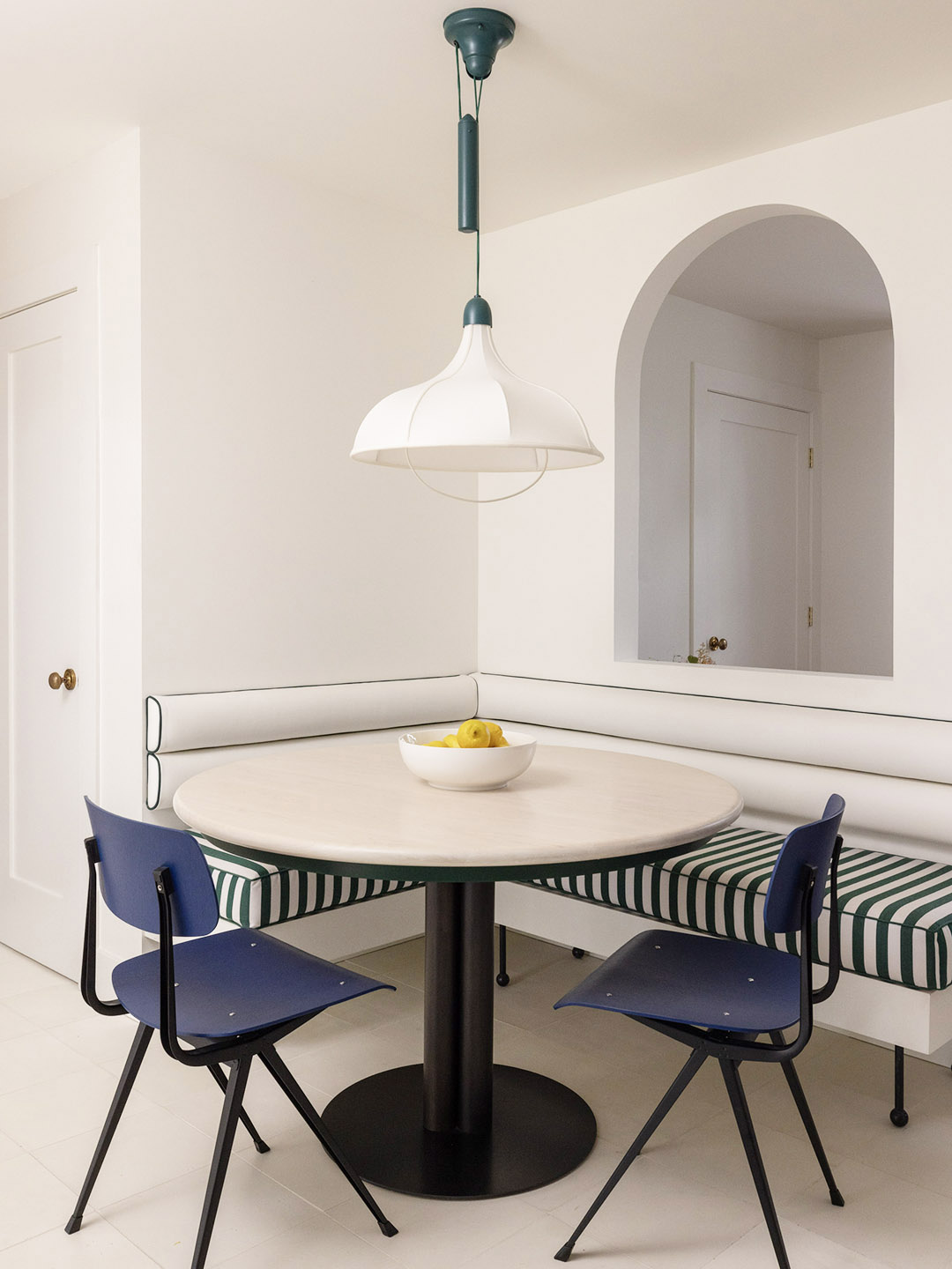 Completing Singer’s dream banquette across the way: a cabana-striped indoor-outdoor cushion and a tubular white leather backrest. The team carried the emerald green hue onto the custom dining table, made by Singer’s friend Steven Bukowski, in collaboration with Hannah Bigeleisen, with a simple band of color underneath the bleached maple top. “I really wanted big pieces that I have a personal connection to,” says Singer. The Beata Heuman pendant light overhead is fixed on a pulley system so it can be raised or lowered if needed. “Everyone tries to squeeze into the banquette because it’s so cozy,” says Singer. “I’ll work there sometimes during the summer; we’ll all eat breakfast there; my daughter really likes to bead at the table.” Its little balled feet might be tiny, but through dinner parties, WFH, and craft projects, they’ve proved their might.