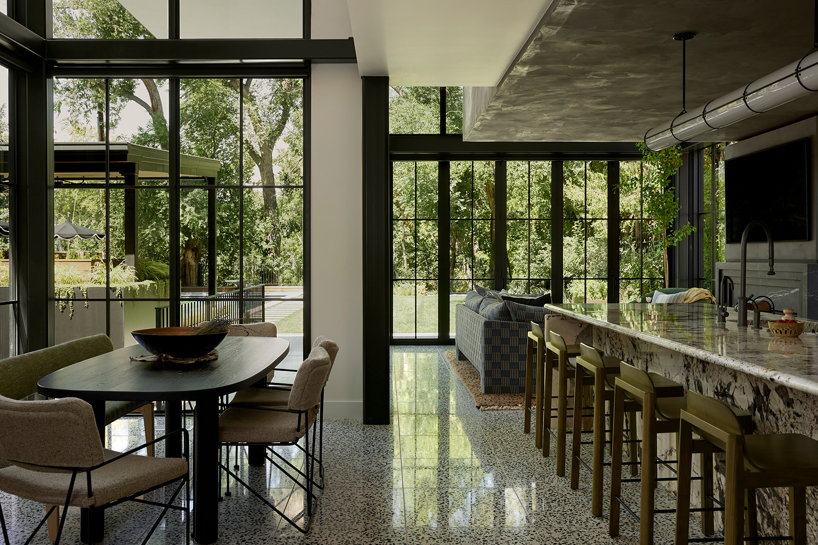 The green-, black-, and brown-flecked terrazzo, a jumping-off point for the whole design, was the clients’ idea. Once sealed properly, the material is practically indestructible (it’s water- and stain-resistant) aka perfect for indoor-outdoor living. “The kids are watching TV, then they’re jumping in the pool, then they’re on the trampoline,” says Flowers. Now the homeowners can open the floor-to-ceiling accordion windows without stressing out about guests—or, more likely, their kids—tracking mud inside. Bonus: Sealants can also make the surface less slippery, which is key when your floors are pool adjacent.