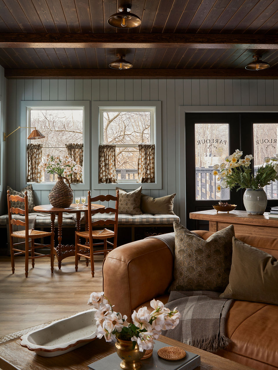 In the main room, she tweaked the points of entry, adding double doors where there were once windows to the left of a large stone fireplace. The hearth itself got an update, too: The old faux stone was swapped for natural materials and an expanded mantel, which features a set of vintage snowshoes as decor. “We knew that would be the focal point,” says Montgomery. From there, she carved out additional seating areas: the sofa zone, a pair of comfortable side chairs, a built-in window bench, and breakfast table seating. Upstairs, a pink-paneled space can host anything from yoga classes to elaborate dinners to wedding festivities.