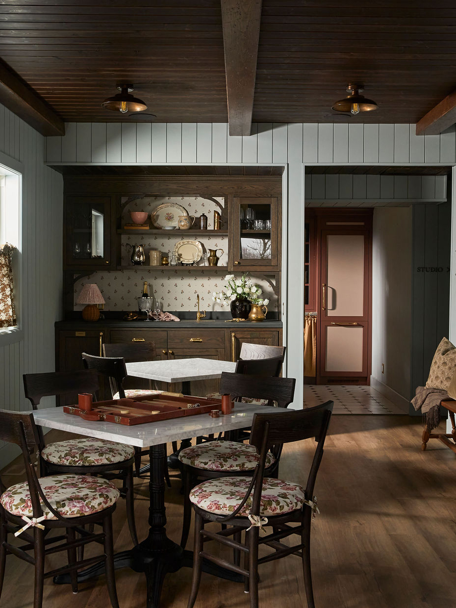 Underfoot throughout, Montgomery added luxurious woodlike vinyl planks, which are highly durable and easy to clean. The walls were paneled, while the ceiling woodwork was stained in a dark hue. The lighting plan was developed for glowy warmth: Montgomery didn’t include spots in that mix, instead sticking with flush mounts and sconces instead.