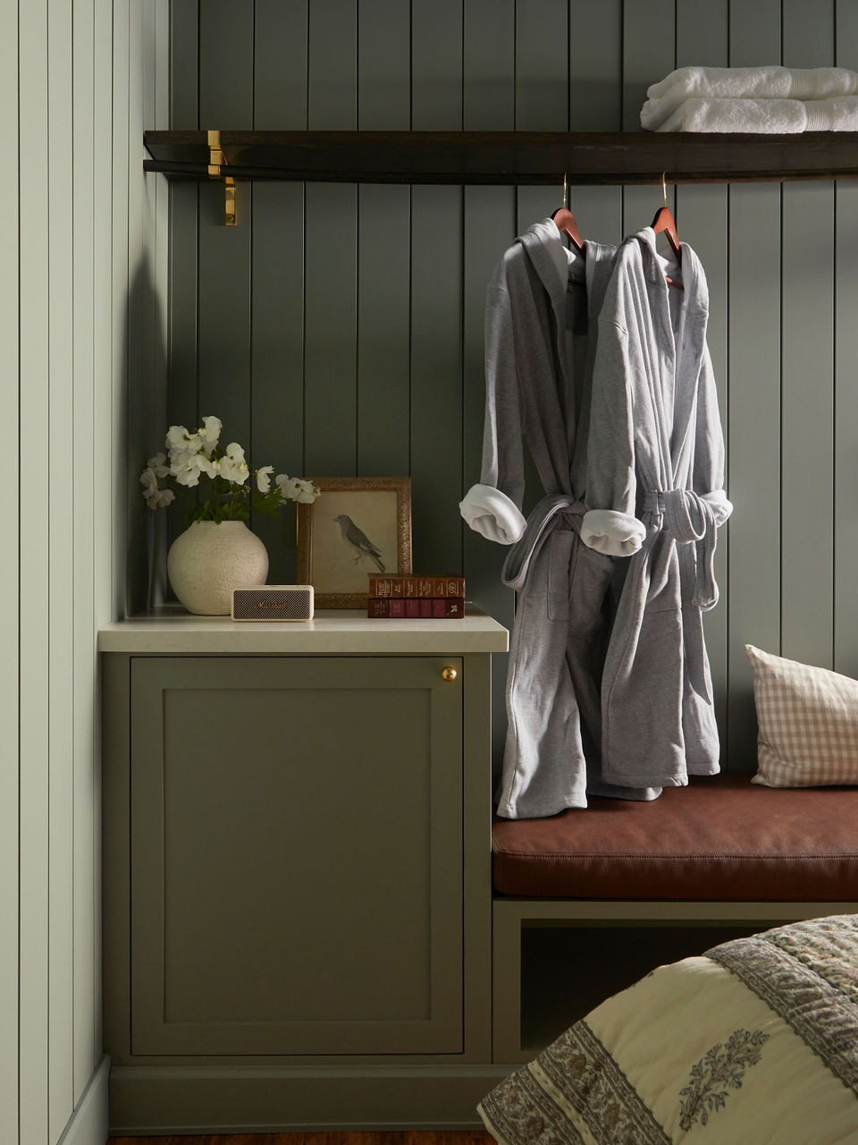 The property had been functioning as a motel up to the point when Sklash and Brown bought it, but the guest suites, though habitable, weren’t exactly charming. The waterfalls were nixed immediately, as were the fake fireplaces. To create a sense of cohesion from room to room, Montgomery developed a repeatable design concept with painted paneling, wallpaper, and built-in headboards. She sourced vintage art to give each space a unique spin.