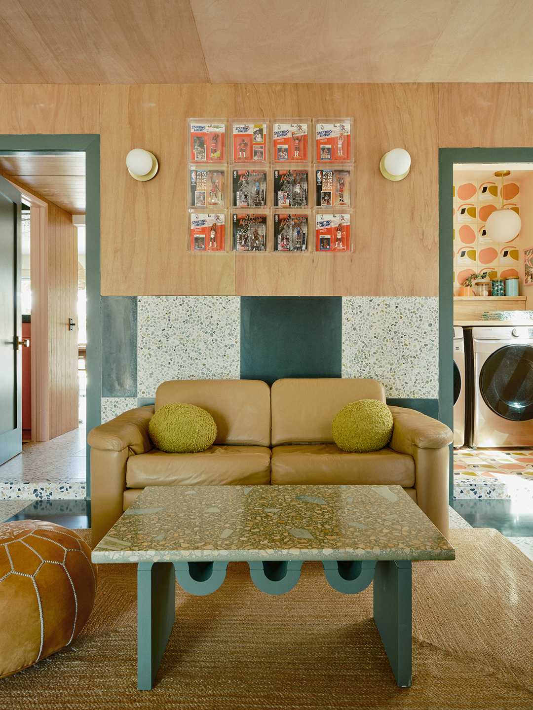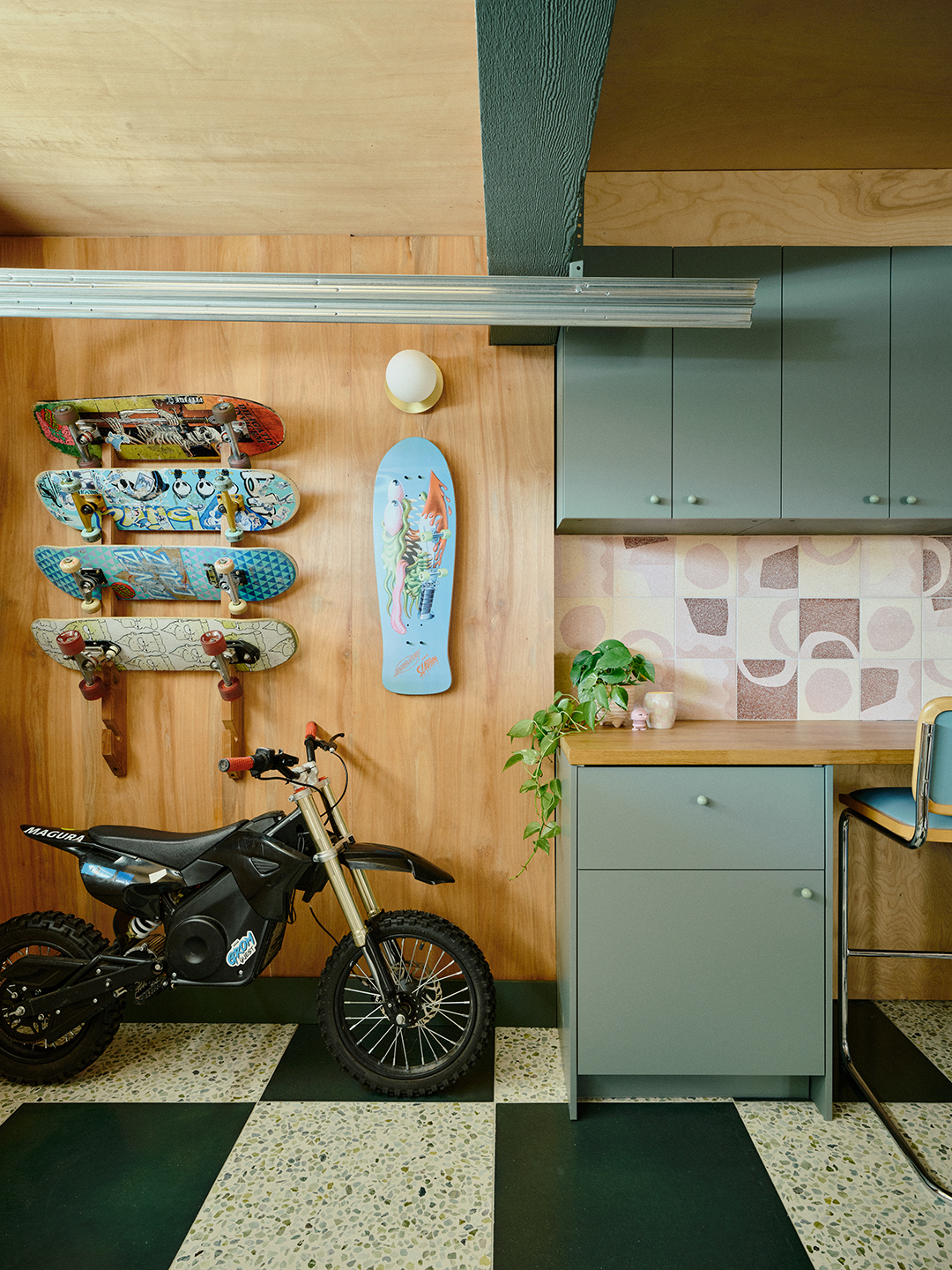 Rather than redoing all the drywall, Balsis decided they would cover it up—including the ceiling—with a material that pays subtle homage to garage workshop origins: plywood. “It’s an inexpensive alternative to layering finishes and painting, and it really elevated the space,” says Balsis. The cladding is also a nod to skate culture and the perfect backdrop to her sons’ board collection. “This is a storage solution, but to me, those skate decks also function as art,” she says, as do the trading cards and figurines given pride of place in the space. “These walls reflect what’s relevant to us.”