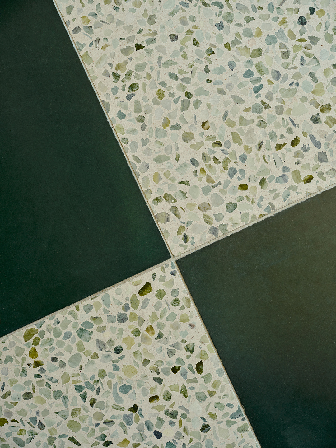 “Compared to re-creating an improved version of what was originally there, tiling was relatively cheap,” says Balsis. (Admittedly, being able to pull products from your own company helps.) “Stone aggregate is super-durable and easy to clean, and it sets the tone—everything in here kind of pulls from that green terrazzo.” The large-format checkerboard pattern extends throughout the space, continuing halfway up the wall on the interior side of the partition. “Our one rule is ‘no white.’ We just like to have everything saturated with color,” she adds.