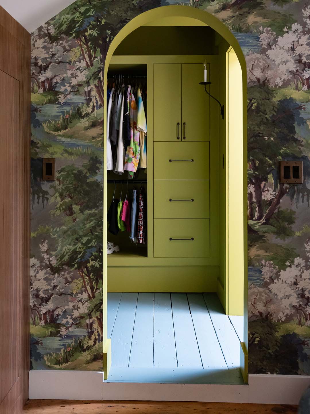 In this walk-in closet designed by Karley Brown-Sgandurra and Joe Sgandurra, the husband-and-wife team behind The Eden Co., the plan was to contrast the renovated bathroom’s relaxed vibe. While one of the clients was onboard with Benjamin Moore’s punchy Split Pea color, almost everyone else was hesitant. But luckily, the unexpected choice was a hit. Which brings us to our next point…