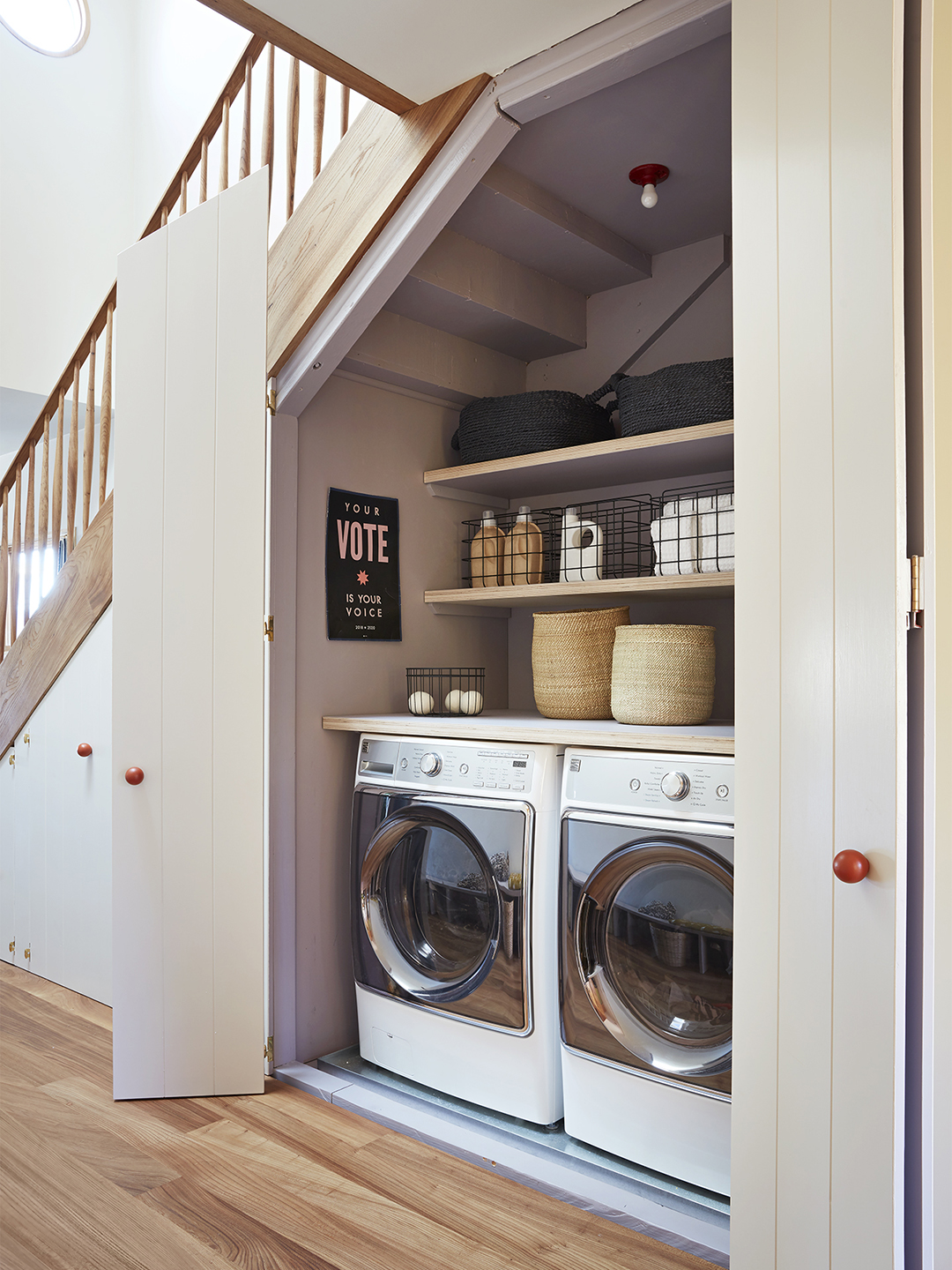 Don’t have space for a dedicated laundry room? Turn the unused square footage under the stairs into a small-but-mighty washing station, hidden behind bifold doors. That was where Joanne Duong Bartels and Luke Bartels landed for their San Francisco home, which comfortably fit two people but needed to work for a family of four.
