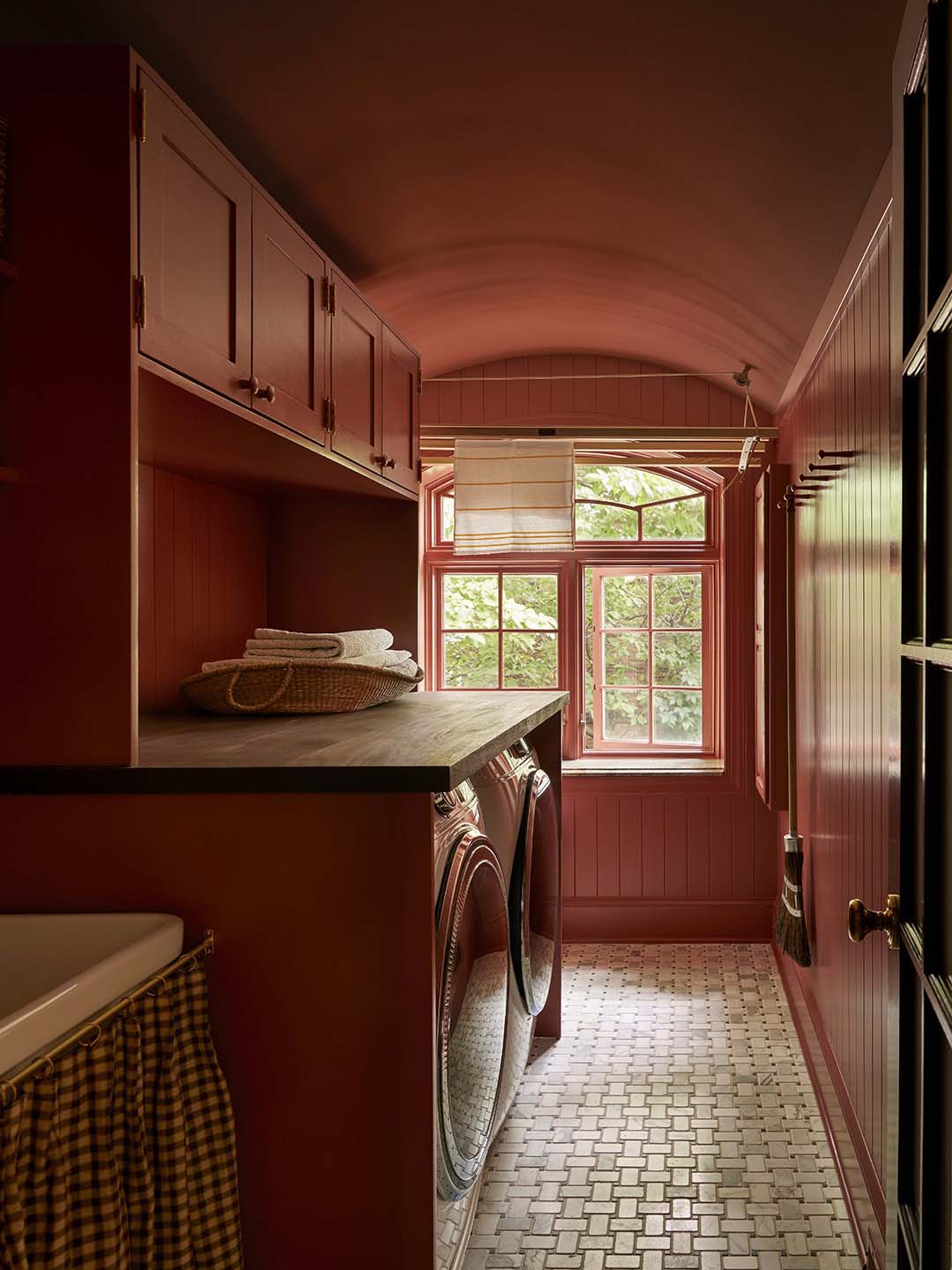 Brooklyn-based design firm Studio Dorion, paneled the bathroom–turned–laundry room in this Philadelphia rowhouse as a nod to its English farmhouse–style kitchen. Housing the washer and dryer underneath a warm wood countertop and dressing up the sink with a gingham skirt tone down the utilitarian aspects even further.
