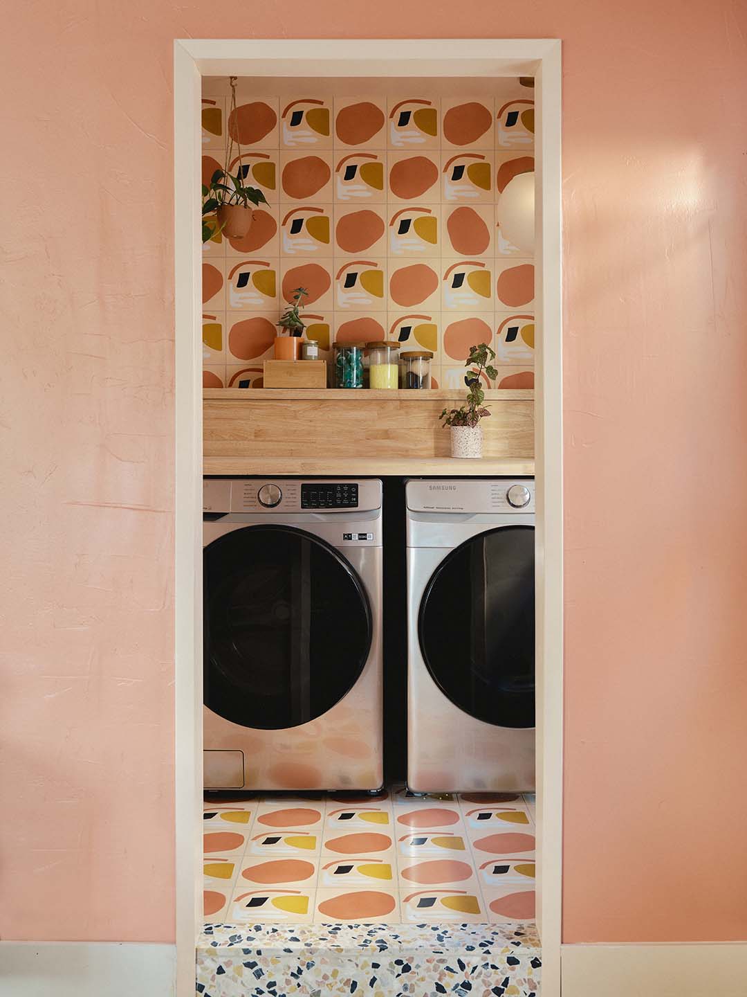 Out with quiet luxury, in with pattern on pattern (on pattern). In the California home of Kate Balsis, cofounder of Concrete Collaborative, terrazzo is a neutral. “Pretty much every hard surface is terrazzo,” Balsis says. “There are nine different styles in [the home] total.” Graphic tile in a similar colorway covers both the floor and walls in the laundry room, the epitome of putting fun in functional.