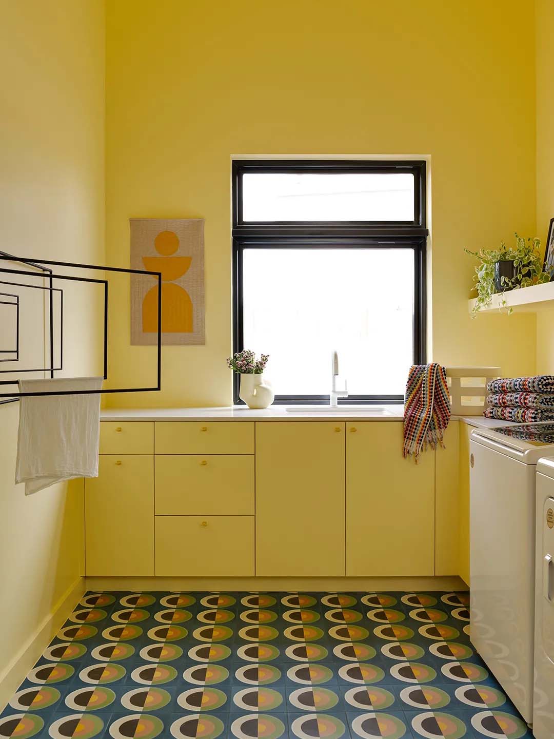 In designer Maggie Glendenning’s Utah home, the sculptural wall-mounted drying system in her bright yellow laundry room came from Europe. “I was trying to find a cute one, because I don’t like to put things on hangers and I didn’t want a [ceiling] hanging rack,” she explains. Baskets, hampers, hangers, and clothespins are other worthy contenders for an aesthetic upgrade.