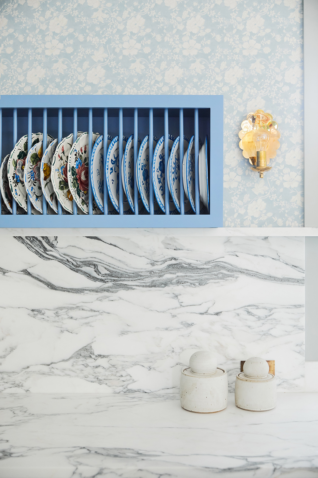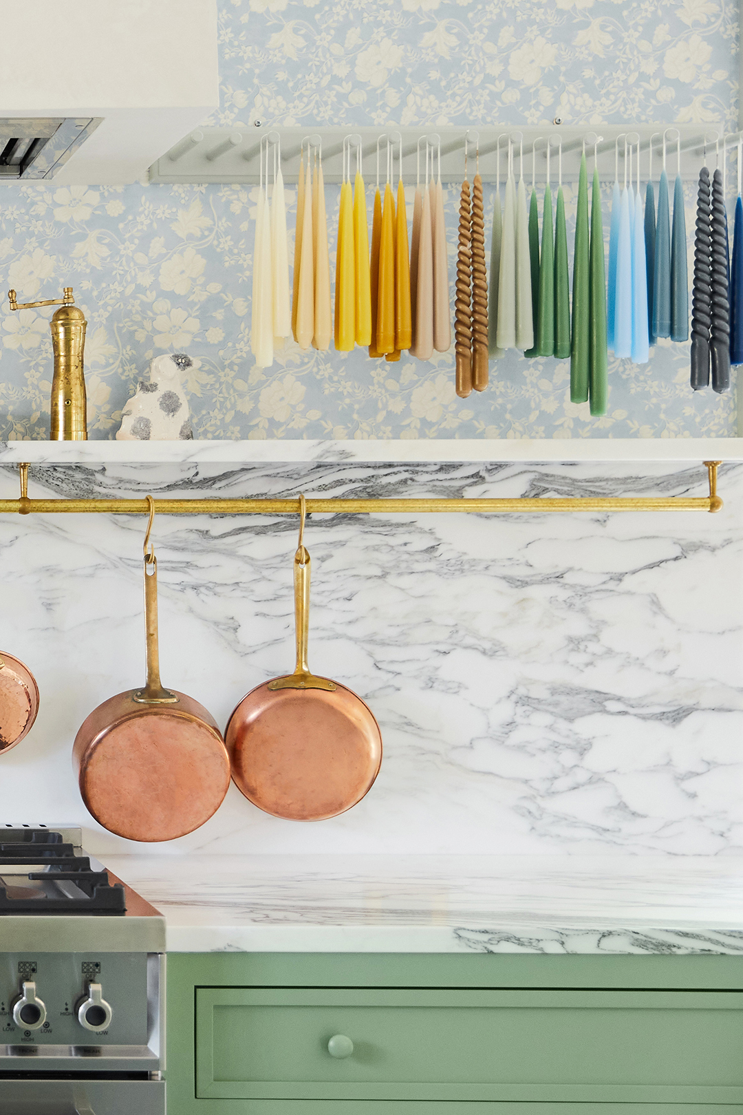 Accessorizing a kitchen to Randall means having her entertaining ware out on full display. There is a dedicated rack for her ever-growing plate collection, spanning pieces by Kaneko Kohyo, Pomelo Casa, and Carolina Irving & Daughters, as well as one for all her taper candles. Randall scooped up a slew of colors from Danica Design Candles in Maine, knowing she’d be burning them (almost) around the clock. “My friends and I were in Copenhagen last June and even during the day in the summer, they would have candlelight,” says Randall. “It was a lightbulb moment for me: I had never considered using candles during the day.” Even lunchtime feels special thanks to this addition.