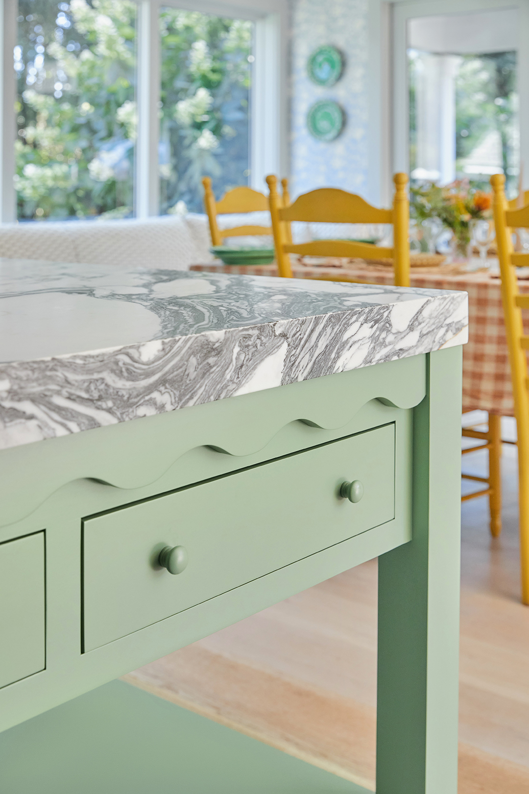 Originally, Randall’s plan was to swathe her new cabinets by Unique Kitchens & Baths in subdued French Gray. “Then I just had this epiphany: no, I need a crazy green kitchen,” she says. After many panicked calls to her designer, Randall committed to a different Farrow & Ball hue: Pea Green. “Which I don’t think is an accurate representation of what the color is,” she points out. The shade is much brighter and crisper than the soupy yellowish shade that automatically comes to mind when you hear those two words. Wanting details in the millwork, like the scalloped trim along the island, to be the star, Feldman suggested saturating the knobs in the same color, too.