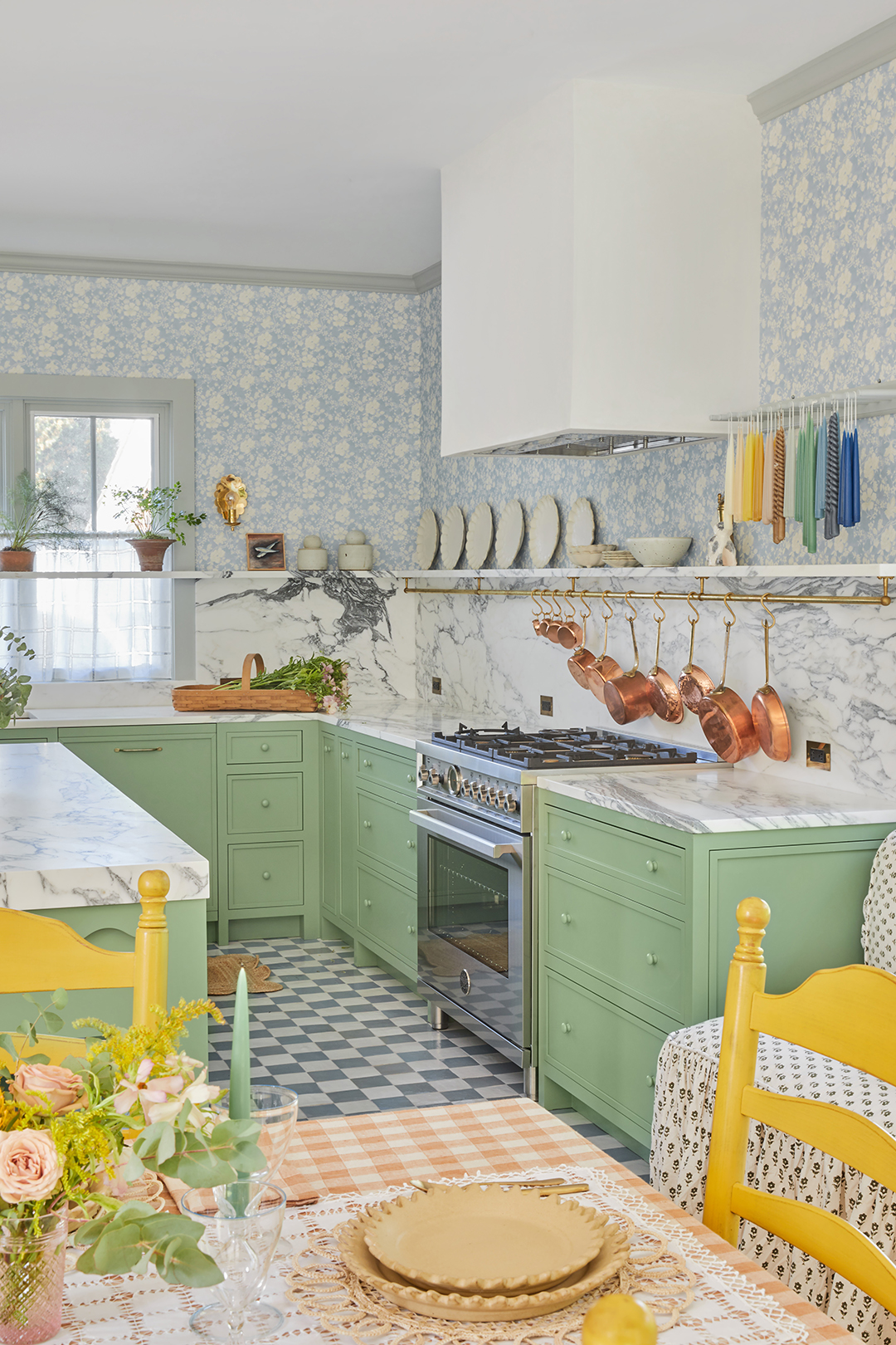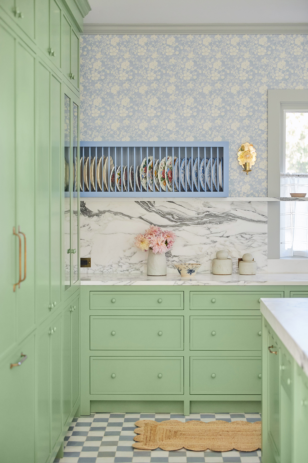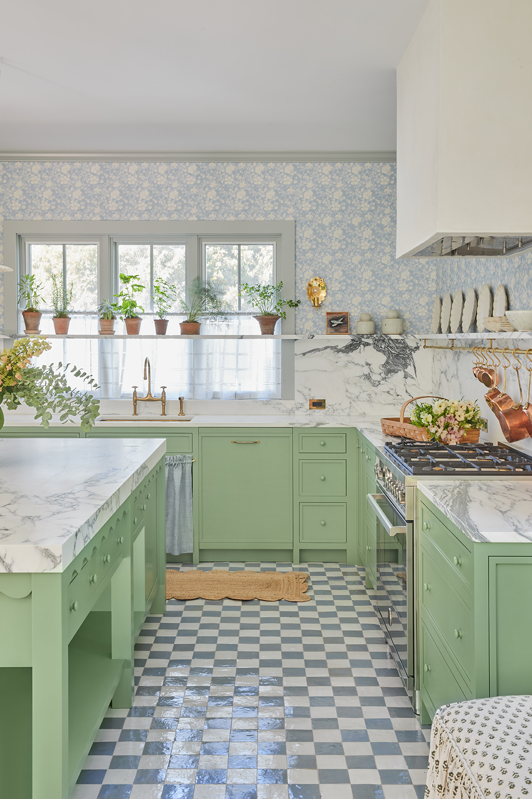 There was no question that the existing kitchen floors were banged up. The dilemma was, if Randall were to replace one section of boards, would she have to replace the ones that span into the living room, too? “All of a sudden, I could see the numbers ticking up to something very scary,” she says. Feeling inspired by a trip she had taken with her design team to Marrakech years ago, she decided to redo the cooking zone in checkered zellige tile from Mosaic House. The large-scale pattern is white and sky in 4-by-4 squares; the border is Dama Corner in white and green.