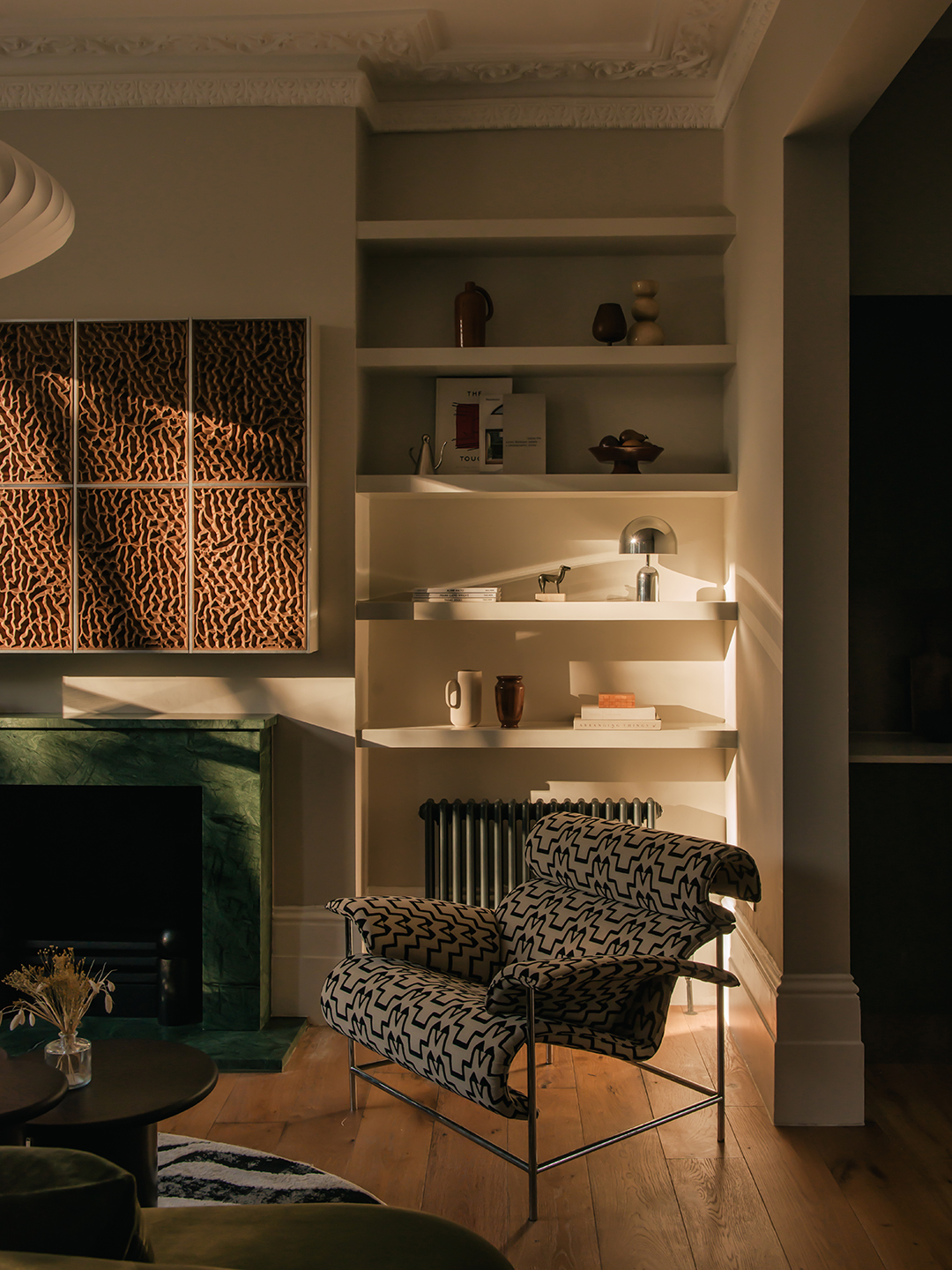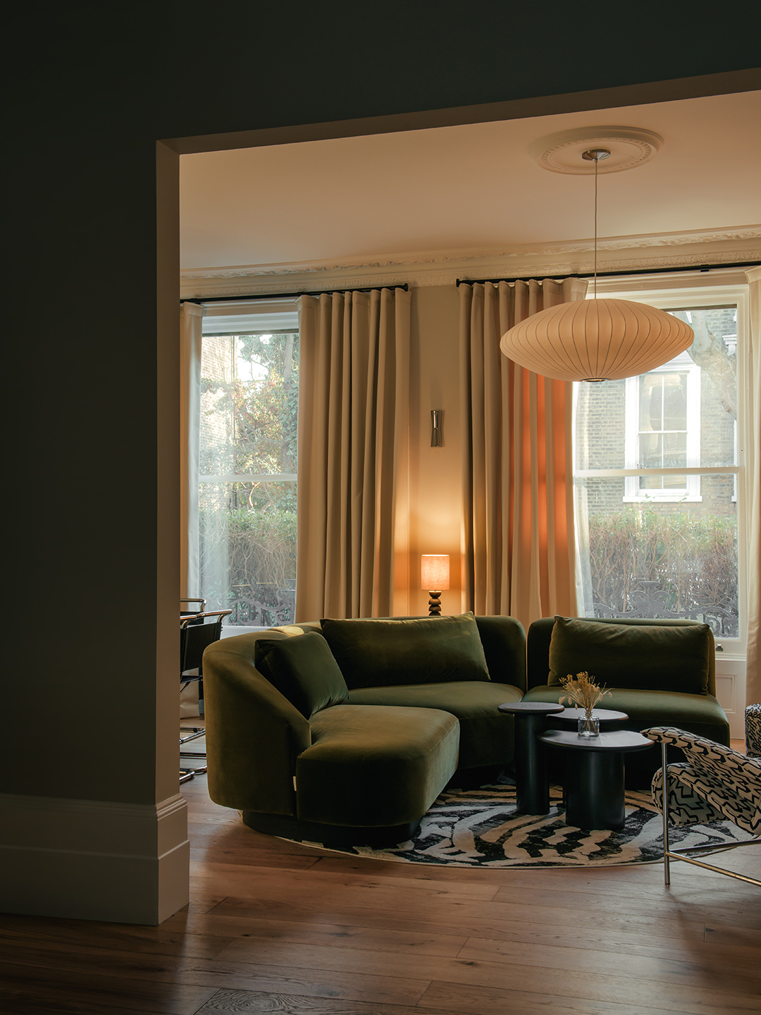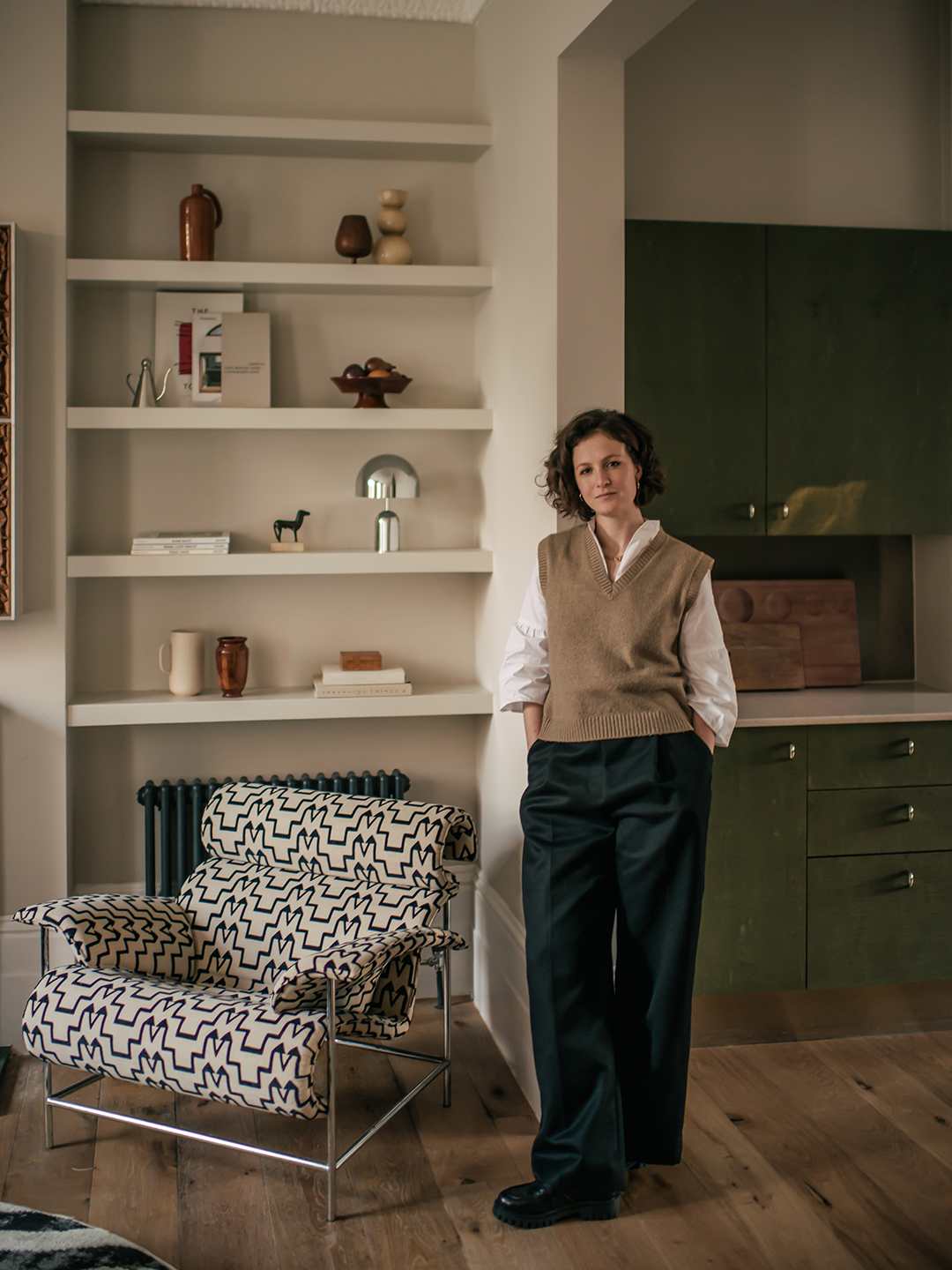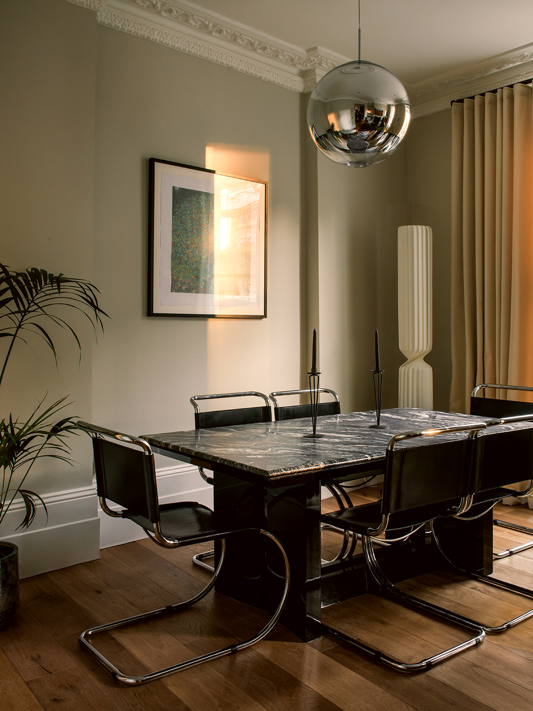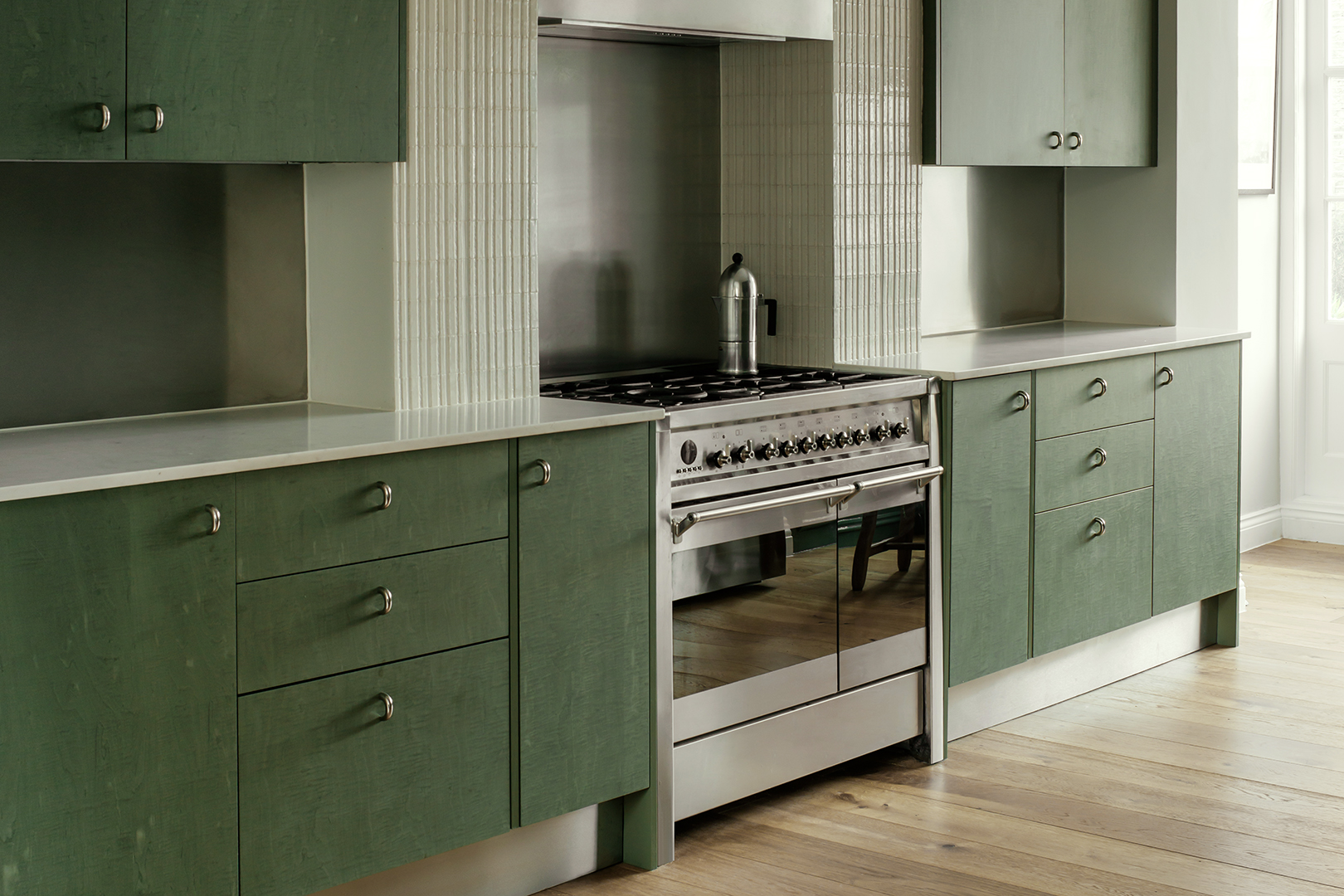 The first time designer Tabitha Organ sat down with her client, a young London-based tech entrepreneur who had recently bought his first home, he showed her a photo of YouTube star Emma Chamberlain’s kitchen. The wood-paneled ceiling is bisected by a giant skylight, and the backsplash tile, countertops, and cabinets are all varying shades of soothing green. “He was like, ‘I don’t know what it is about this, I just like it,’” Organ recalls. Right there, over a drink at a pub, she began to unpack the ideas for his own home: It had to be bold but cohesive and slightly futuristic (cue the chrome). Organ also quickly learned that a few of his friends would be living there, so the place had to be party-proof.
