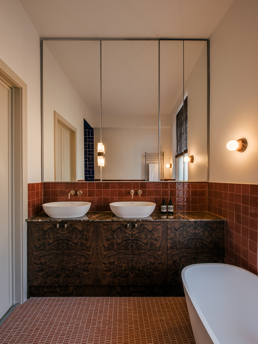The palette in the primary bathroom kicked off with a warm terracotta. For Organ, it was a fitting contrast to all the greens downstairs. “The whole house to me needs to be complementary; even though the spaces are a staircase apart, it needs to all make sense,” she explains.