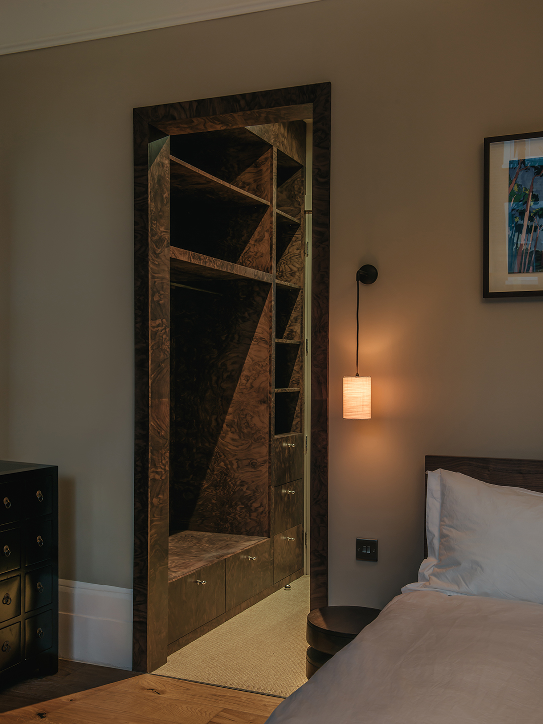 In reconfiguring her client’s en suite bathroom, Organ actually made the room slightly smaller. This gave her some space to add a walk-in closet to his bedroom. As she saw it, this was a much better alternative to having built-in cabinets attached to the walls (there was too much original molding she wanted to preserve). She clad the closet cabinets in the same wood she used for the bathroom vanity: American walnut burl-wood veneer.