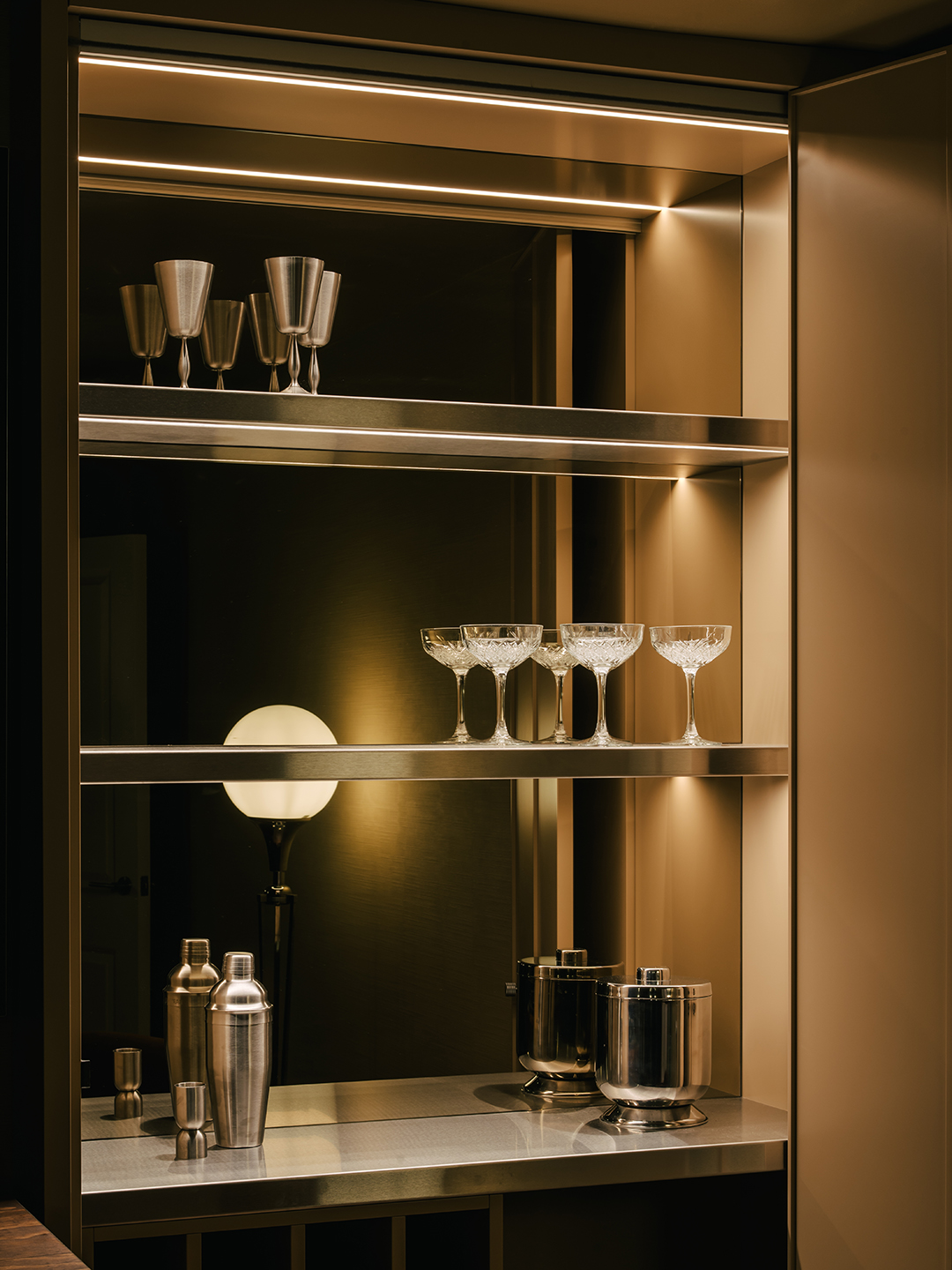 Of course, you need a bar if you’re designing a home club. One of the built-in cabinets Organ incorporated in the space has bifold doors that reveal a stainless steel shelving unit with a bronze mirror backing. “I love that you can’t quite see yourself fully, but just enough to check if you’ve got something in your teeth,” she says.