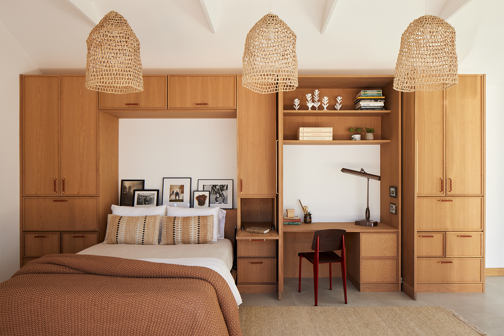 What used to be a two-car garage is now what Casper calls a “Swiss Army knife space.” Originally, the unit was meant to be a place for the homeowner to work remotely, but it snowballed into a space to host family and friends for long stays, an area to work out in, and a room to host poolside gatherings. Casper made the most of the 400-something square feet by utilizing the windowless side of the lofted ADU to create the ultimate built-in. The millwork encompasses a Murphy bed, a secret desk, a wardrobe, and tons of storage for yoga gear and entertaining ware. Popping open a bottle of champagne with a knife is impressive, but we love a party trick that involves flipping a cabinet open to reveal a nightstand.
