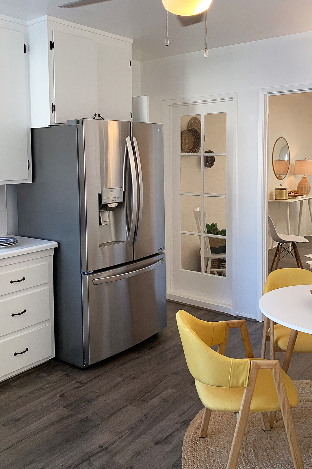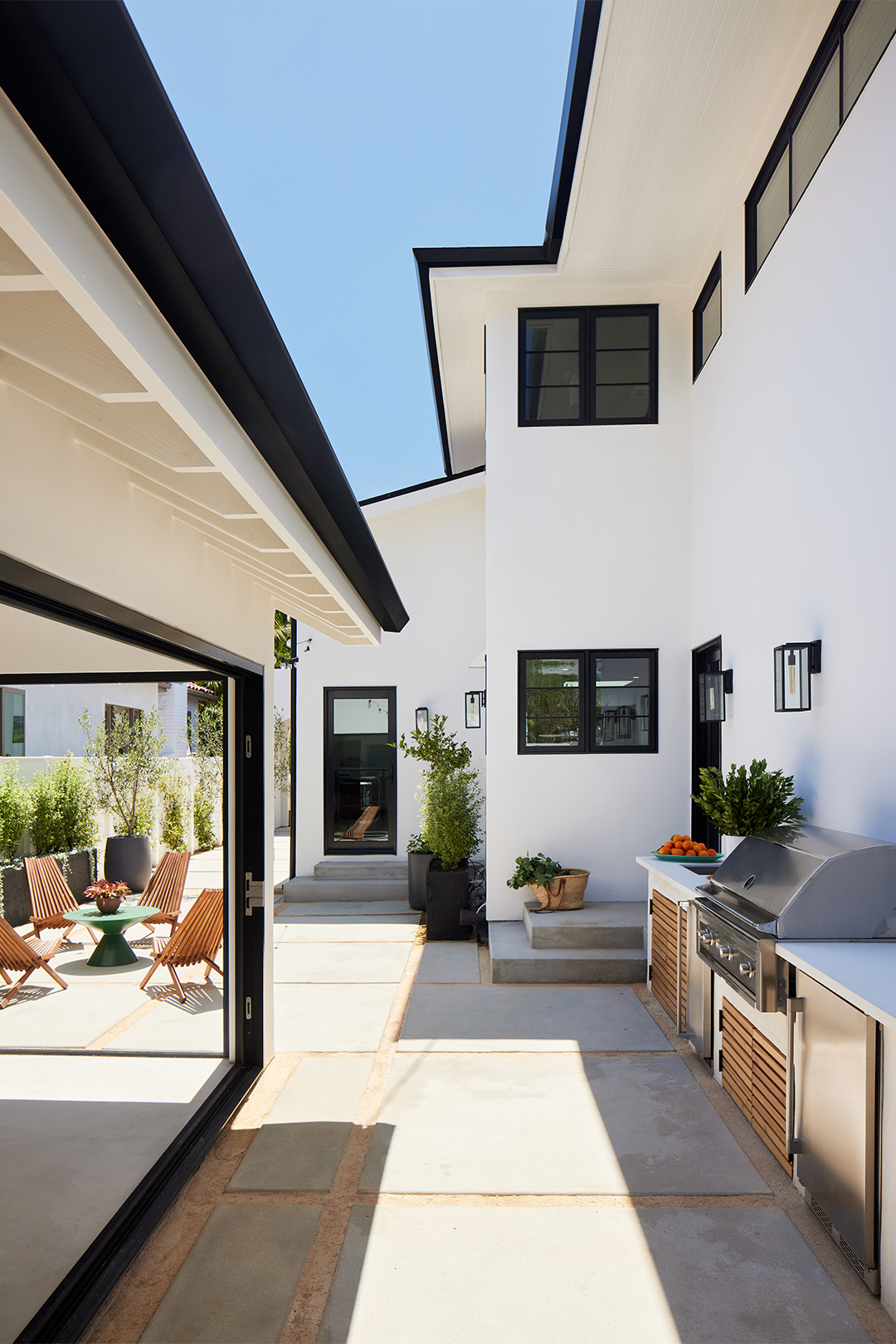 While the exterior might look very similar to how it did before Casper stepped on the scene, the designer actually had the whole facade re-stuccoed and all of the old wood windows and doors replaced with aluminum-clad ones that are not only more energy efficient but cohesive in style. “There were six or seven different types of windows before,” she recalls. “It had this Frankenstein effect. When you were inside, it didn’t feel unified.” It just so happened that Salah loved the existing black and white scheme, making for a less dramatic reveal. “It felt classic to her,” says Casper. Danny Butch stepped in with a fresh, low-maintenance landscape design.