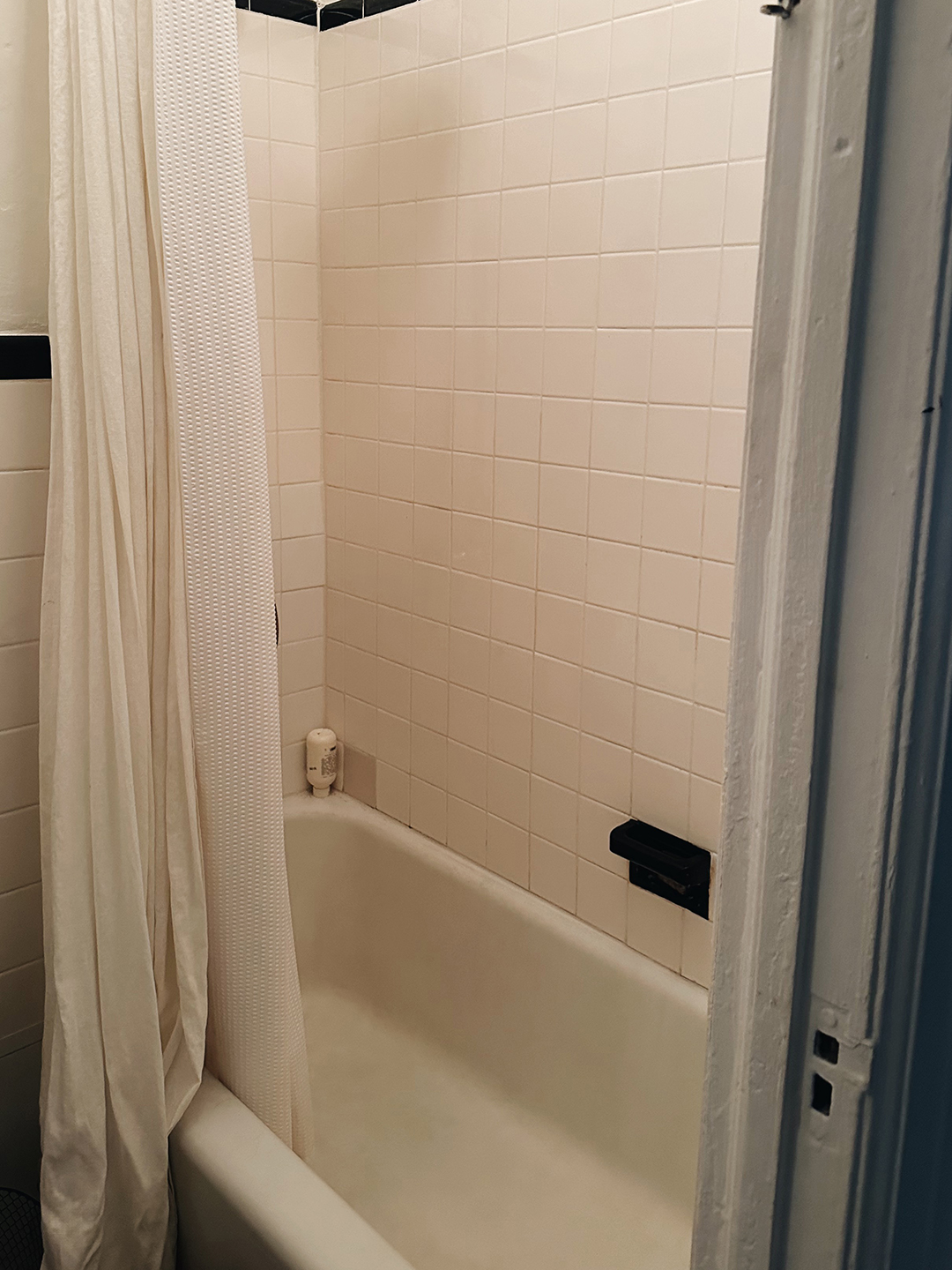 Fast-forward to present day—Muller is projects-deep into her Greenpoint rental renovation, documenting every clever DIY on her @hummusbirrd Instagram account. When she finally got around to tackling her tiny bathroom, she decided to bring the Ludlow to her by reglazing her tub and cladding the edges in marble. There was just one small oversight: Every time she took a shower, water would accumulate on top of the stone and spill onto the floor. For almost a year, she tried various shower liners, but she always ended up mopping the floor with a spare towel. “Ultimately I knew I had to come up with something better,” says Muller.