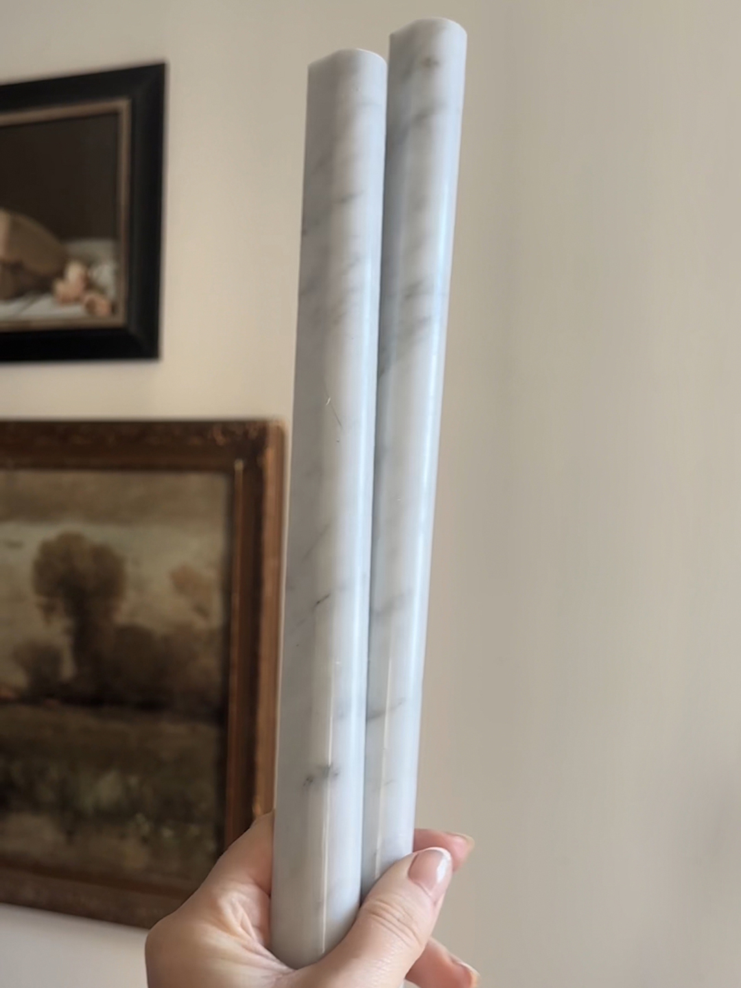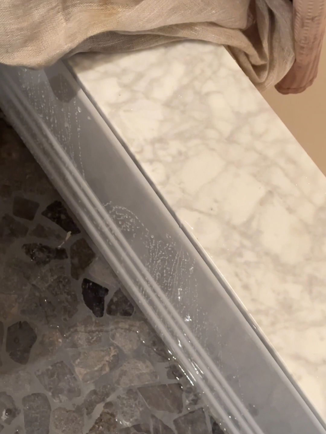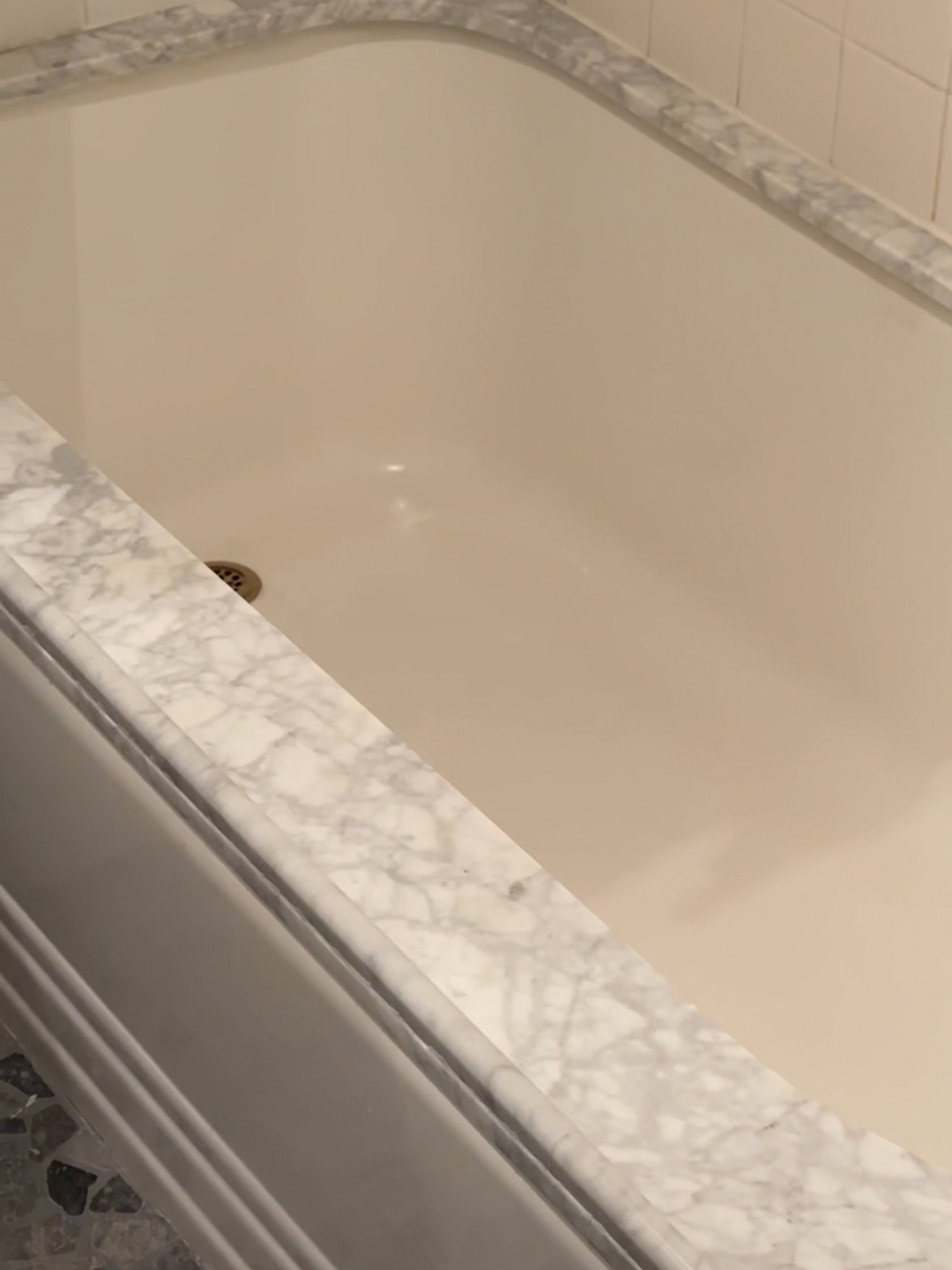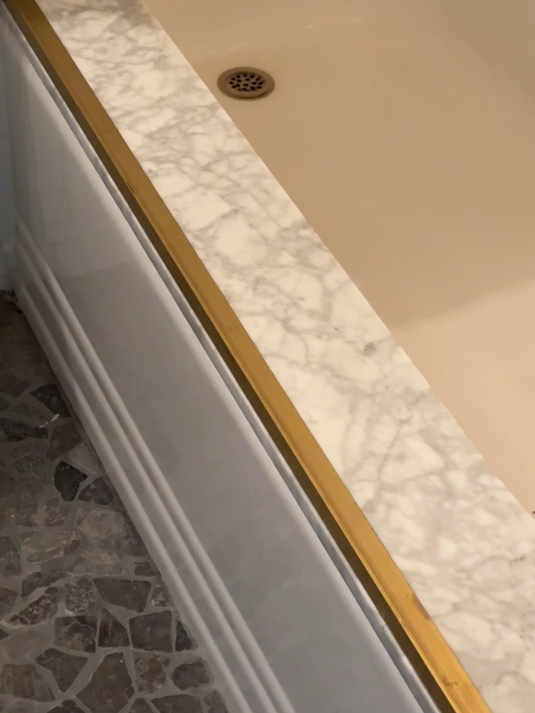 Turning back to the Ludlow for inspiration, she bought a piece of brass edging and tested it out against the tub edge. While it could have solved the problem, Muller didn’t love the way the metal and stone clashed. So she decided to stay in the same material family and, after a lot of Googling, bought four pieces of polished Carrara marble pencil liner from Tilebar for $12 each.