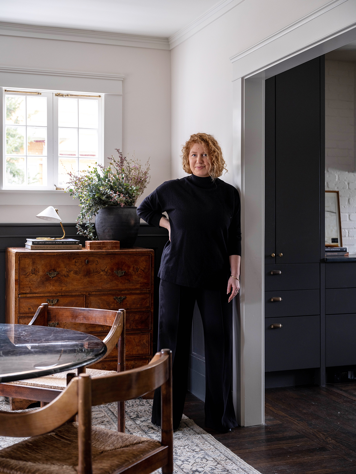 So Moore peeled back the house’s mismatched interiors and revived its historic roots. She took notes from the architecture, embellishing the abode in intricate wainscoting, walnut-burl chests, and an overall sense of “broodiness”—Moore’s signature combination of moody and bright. Spatial flow was also top of mind. Because the home was intermittently updated room by room, it lost its cohesion. As a result, Moore knocked down walls and made unexpected moves (like shaving 2 feet off the dining room) to make the space functional and beautiful for the clients. Here, she explains how she gave the home a modern update without sacrificing its enchanting heritage.