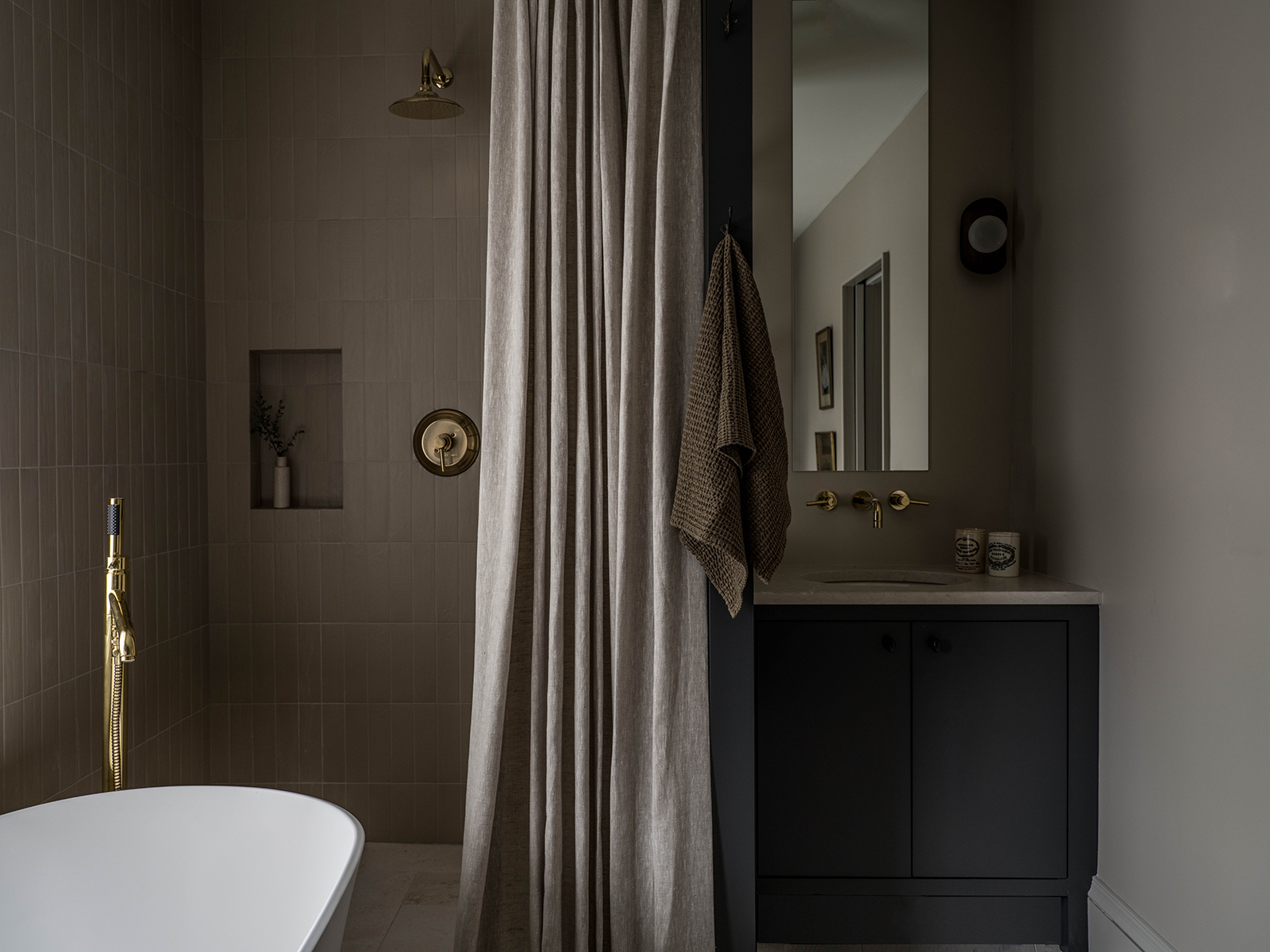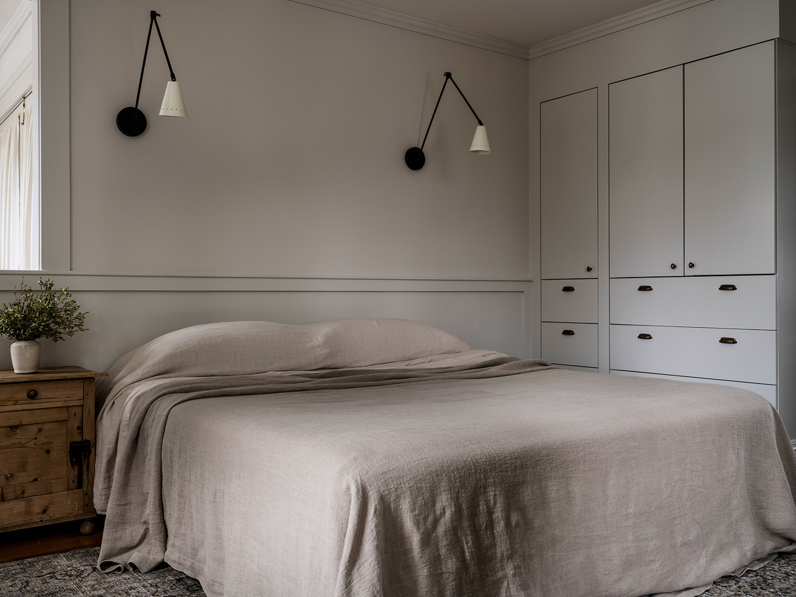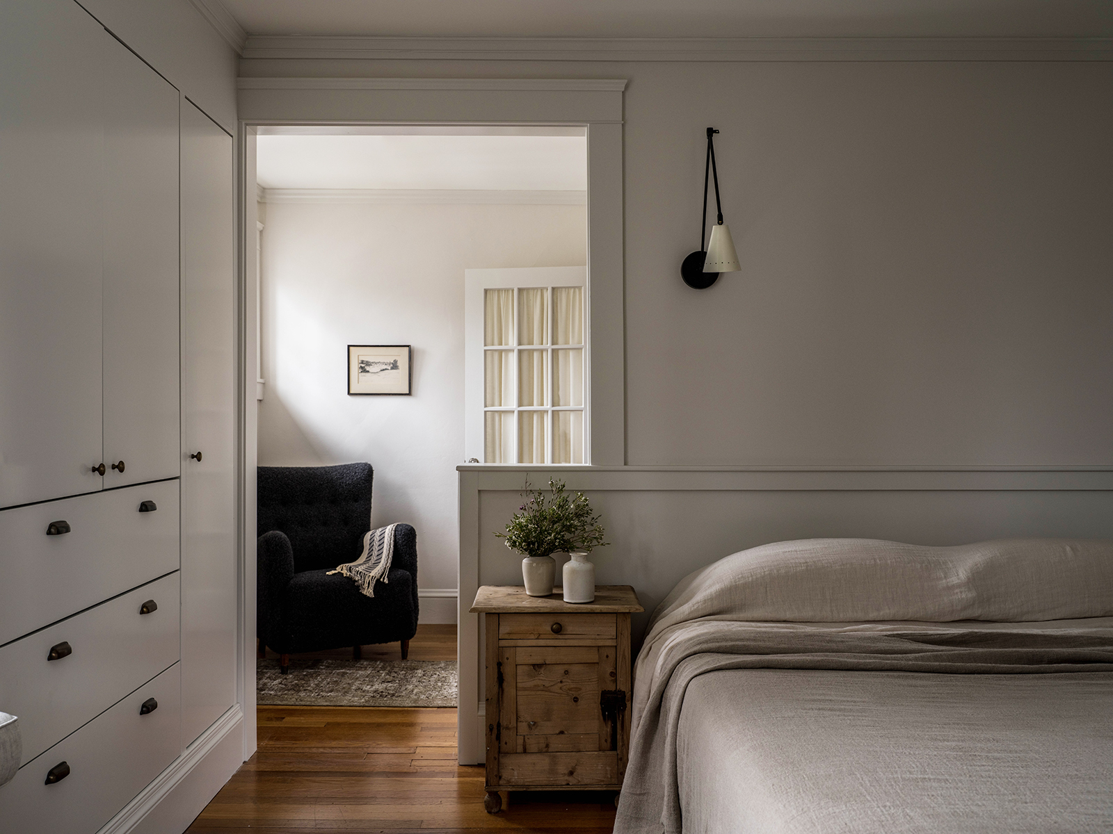 To carve out a true primary suite, the designer gutted the walls to make room for extra storage, but that doesn’t mean she tossed all the scraps. Moore couldn’t bear to part with one of the room’s double-hung windows, so she transported it to the bathroom where it now frames a freestanding tub, soaking it in light. “If it’s a good product, I prefer to reuse it over buying new, because honestly, [it] is usually less quality than when it was built in the 1900s,” Moore explains.