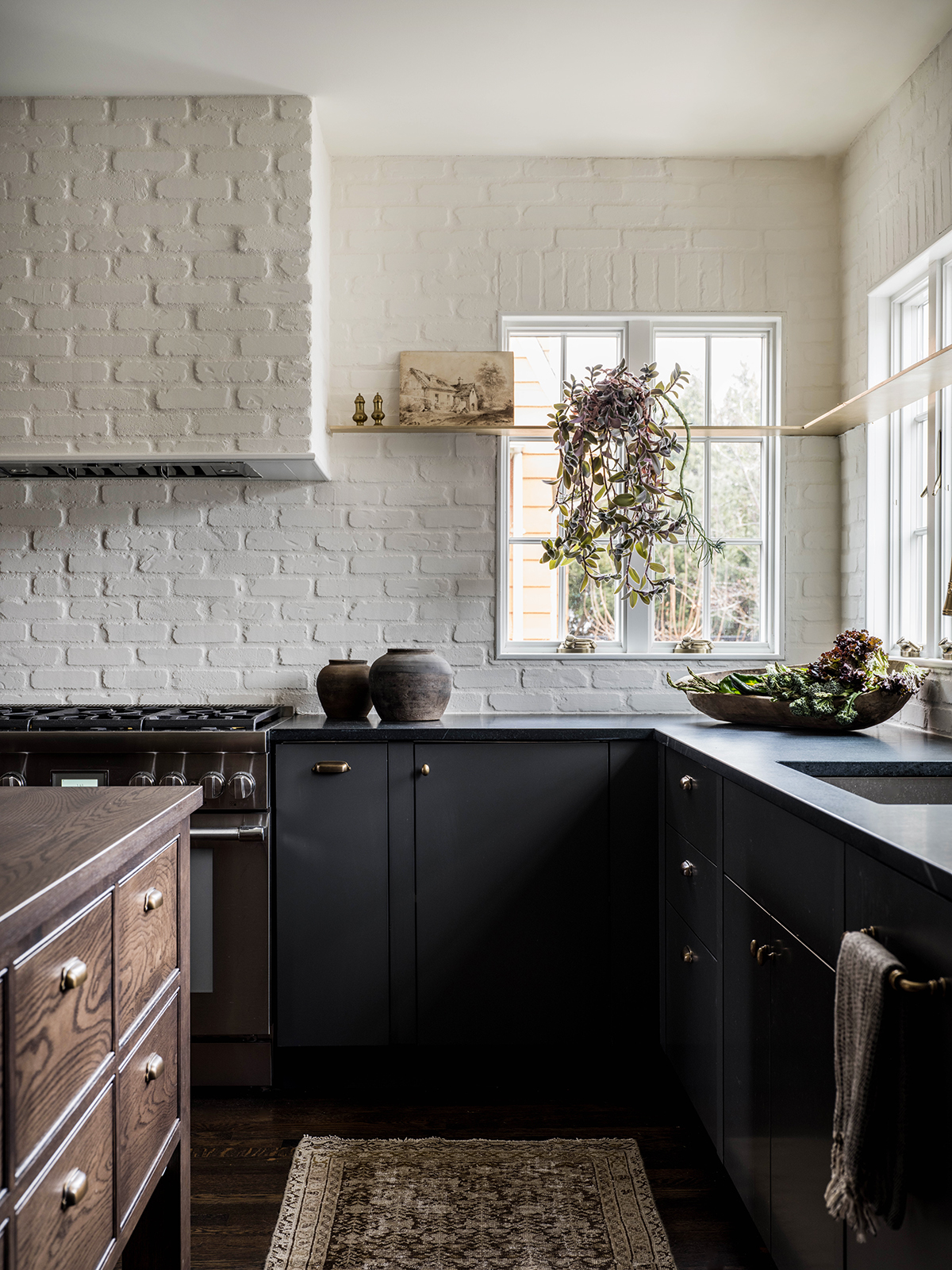 Most of the house’s original brick detailing had been removed over time, so Moore wanted to bring it back—though not just in an accent wall or fireplace. “We engulfed the entire kitchen in brick,” she points out. The stone braids across all four surfaces, from the window headers to the backsplash, even enveloping the vent hood.