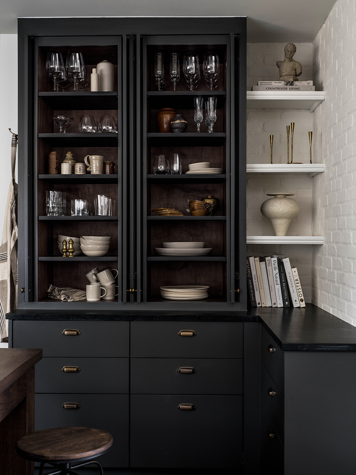 To keep the kitchen airy, Moore ripped out the upper cabinets and instead maximized bottom drawer space, extending the cupboards around brick beams and incorporating hidden island storage. Still, she wanted the family to be able to showcase their glassware—and have an indoor garden. “[The owner] loves using herbs in her cooking,” Moore says. “I was like, how lovely would it be to cascade the herbs on a shelf all the way around the kitchen.”