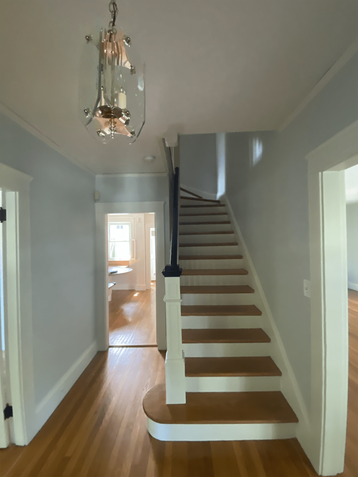 The home’s entryway had a jarring direct view of the kitchen, taking away from the staircase and its elegant newel posts. “It has [a] curlicue detail going up and a nice ogee profile on the top. It was absolutely stunning,” says Moore. The designer blocked off the hallway to the kitchen and swathed the stairs in Sherwin-Williams’s Iron Ore to make it pop. The extra wall space provided room for a dainty iron shelf, which displays the family’s collectibles, offering a softer (and more aesthetically pleasing) landing for guests.
