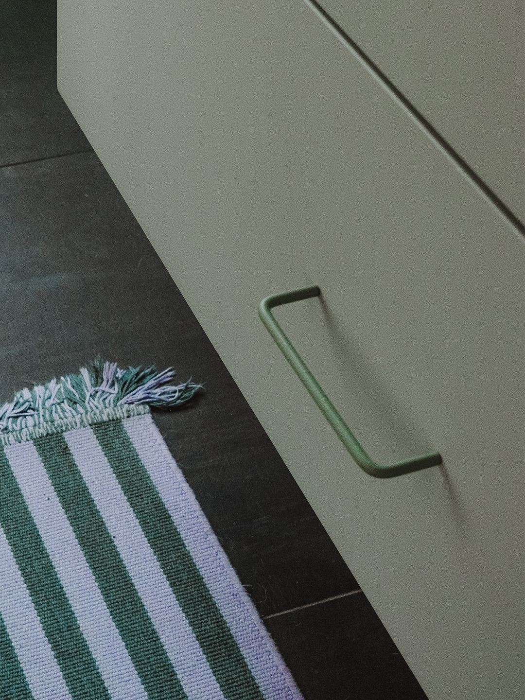 Fabian: The green we chose for the renderings was a seafoam color, but when we actually painted that shade on the wall, it didn’t feel right. We had also considered vertical shower tiles. Then we realized that if we were to install them ourselves, there would be more room for error—it’s triple the amount of tile than the large square ones we ended up going with.