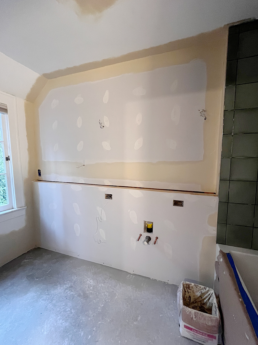 Jess: We also imagined the showerhead and diverter (the valve that allows you to go back and forth between the tub faucet and showerhead) would be placed on the same wall as the vanity…