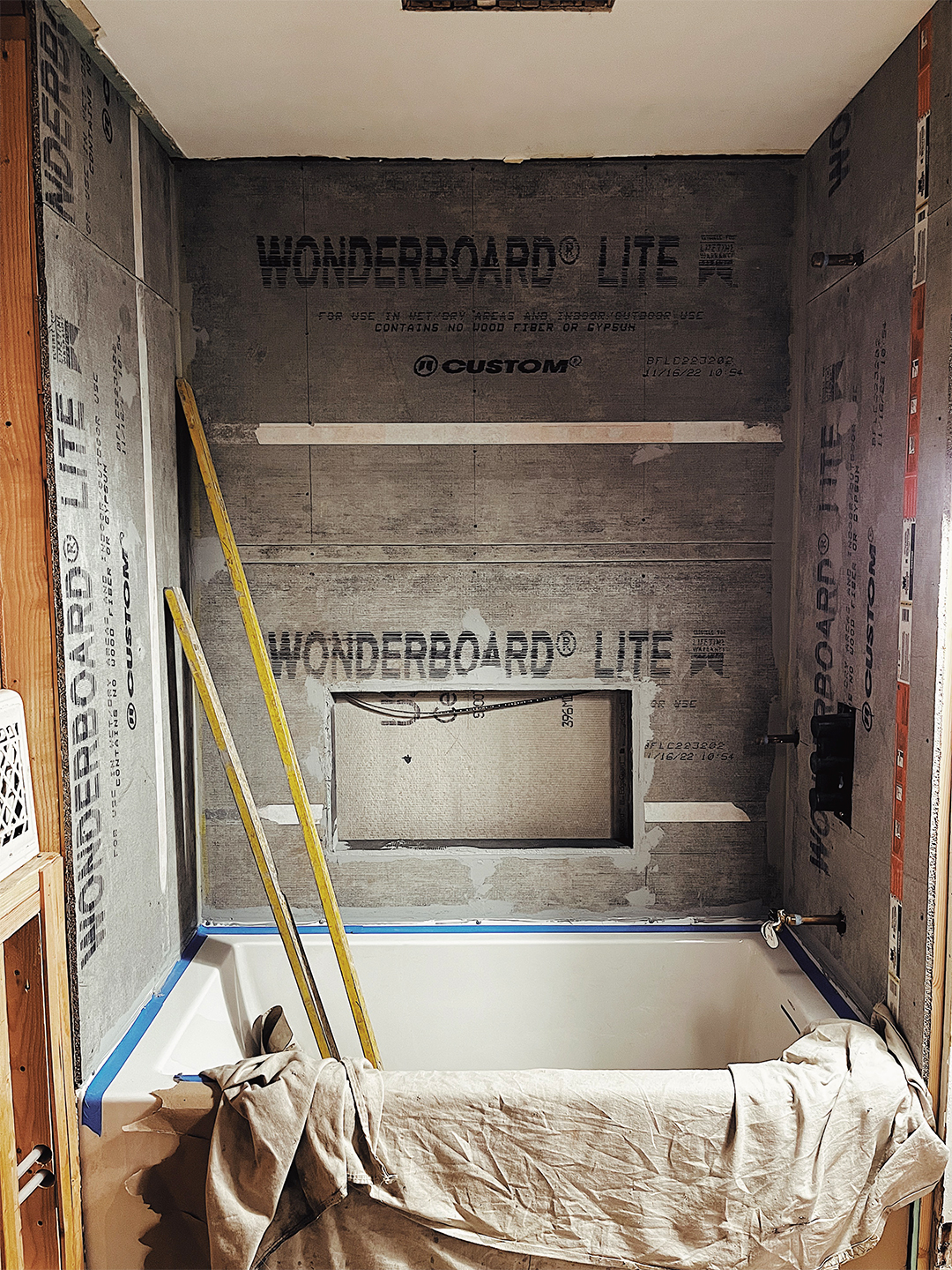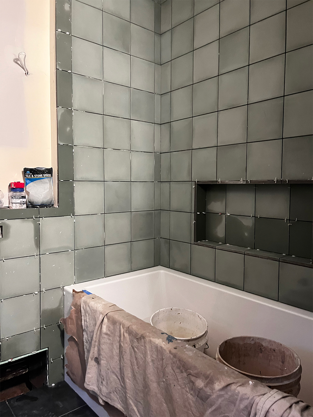 Fabian: My dad flew in from California to help me install the shower and wall tile. We accounted for three days of work. I had no idea until we got started that it would really be a one- to two-week-long process. Once we reached the niche, I realized this is beyond us—I don’t know how to do these little cuts. Will from Aforma advised us to just take down the sections I wasn’t happy with. My dad cleaned up. We returned our tile saw. Then I called the pros who had put in the concrete backer to finish the job for an extra $5,000, bringing the final tile labor and materials cost to $7,550.