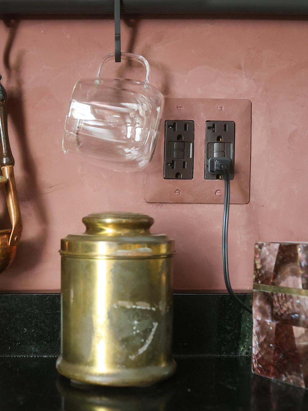 Bruner first tried searching for reddish purple outlets on the Internet, but nothing popped up. The closest hues to Meritage were shades of brown and black, so she bought five different outlets on Amazon to sample. Finally, she ordered six total brown outlets and one black outlet (for the island) through Legrand’s Amazon shop. They blended in perfectly.