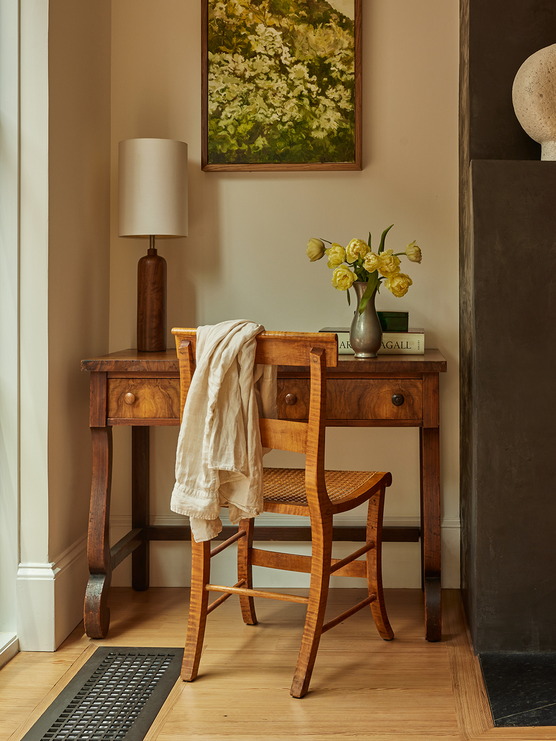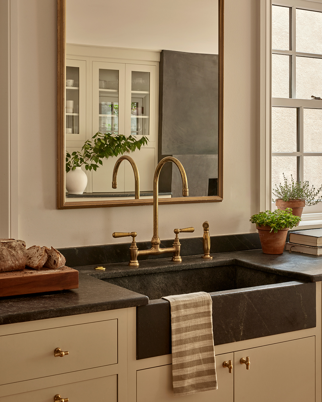 Shaker-style fronts might have been the obvious choice for the kitchen cabinets, and that’s exactly why the designers went with flat inset doors instead. “Shaker felt a little too stiff,” shares Kaminski. “We’re not necessarily preservationists, so taking a more moderate approach was a good way to give it a more playful feeling.” Pew describes the hue they landed on for the millwork (Sherwin-Williams’s Wool Skein) as a mushroom hue with a hint of taupe. “It’s deeper than white but not quite beige,” she explains. “We tend to gravitate toward colors that are kind of indefinable.”