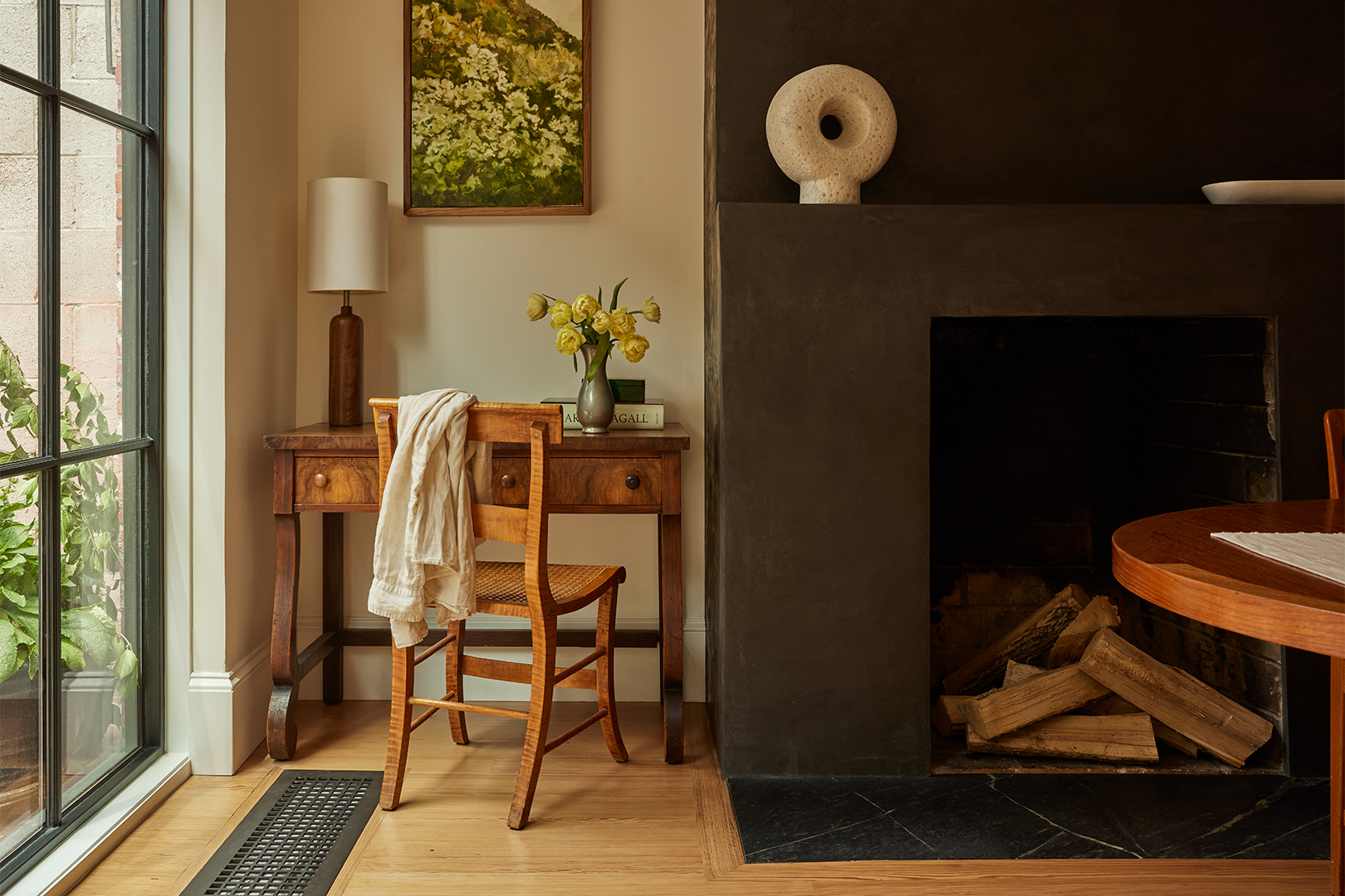 Revamping the brick fireplace in the kitchen was part of plan A: simplify. After covering the facade with a stuccolike material and troweling it to a smooth condition, Pew and Kiminski tasked Lauren Jensen of XOXO Plaster to swathe it in a custom colored plaster. “She’s a true artist with the kind of depth she can tease out,” says Kaminski.