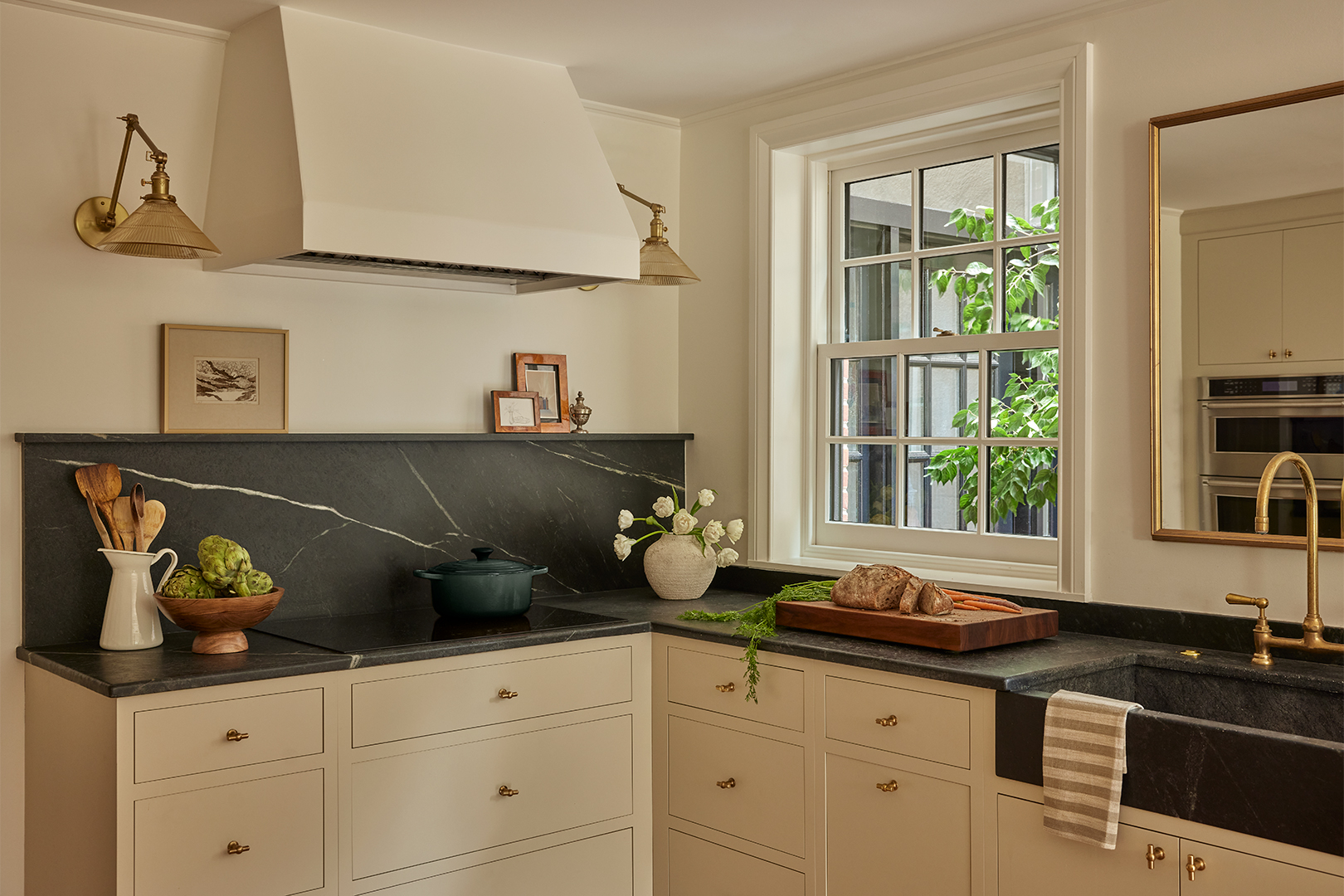 Ditching the peninsula structure that bisected the kitchen and dining area instantly made the room feel bigger. But the question remained: Where should the sink go now? “It’s not an enormous space,” notes Kaminski. With the range newly positioned along the far back wall, the designers decided to tuck the sink in between two windows closer to the cooktop.