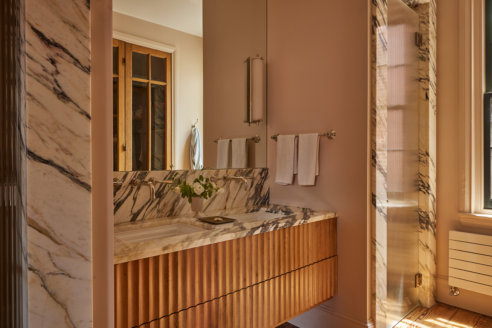 While landing on a new downstairs layout was a breeze, Kaminski admits they went back and forth on the primary en suite at least 50 times. “There wasn’t a clear path,” he recalls. In the end, they decided to build a new primary bathroom and closet where there previously was a bedroom. Luckily, the rest of the details flowed: The clients found a set of old doors on an auction site for the built-in wardrobe; the walls were painted in Cultured Pearl to pick up on the purplish tones in the Calacatta Monet marble counters; and the push-to-open butternut wood vanity drawers feature the same fluting as the glass shower door.