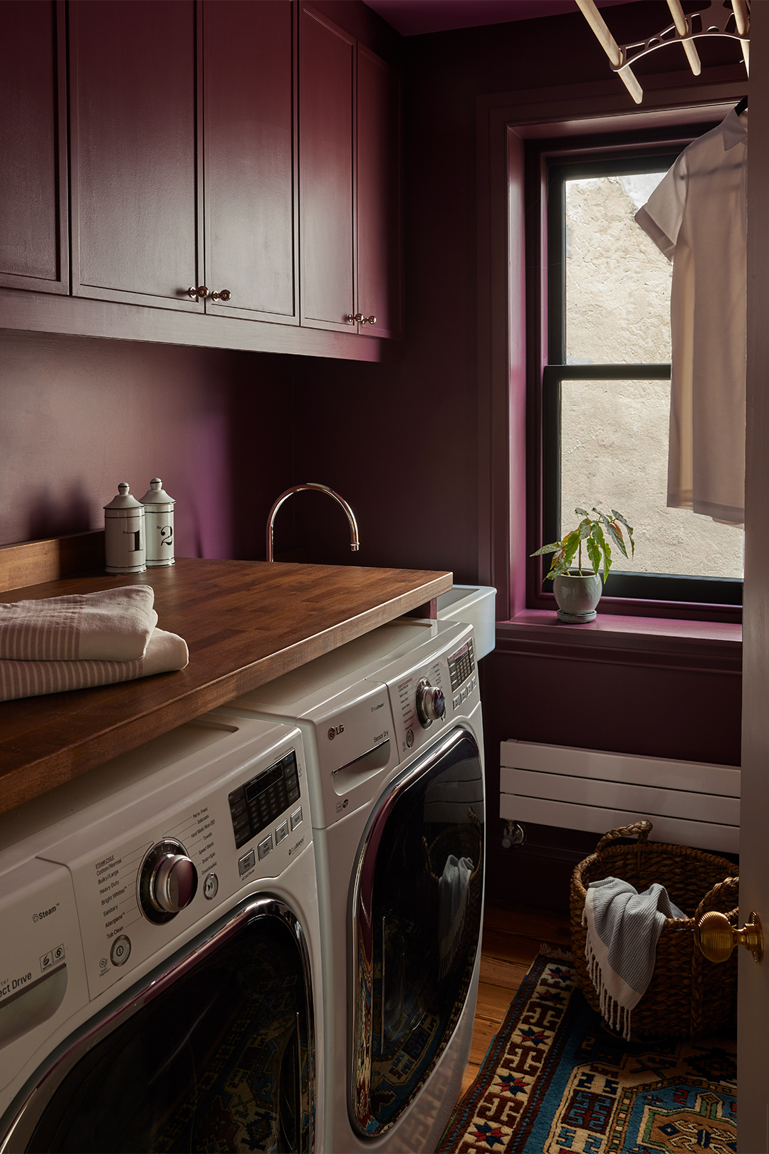 Directly above the kitchen, Pew landed on another “in between” paint color for the laundry room: Borscht, a deep red that is at once both plum and maroon. “It gives a space that would normally be mundane and uninteresting some personality,” says Pew. Knowing that the homeowners usually prefer to air-dry their clothes, they hung a ceiling-mounted drying rack overhead and carved out plenty of counter space for folding.