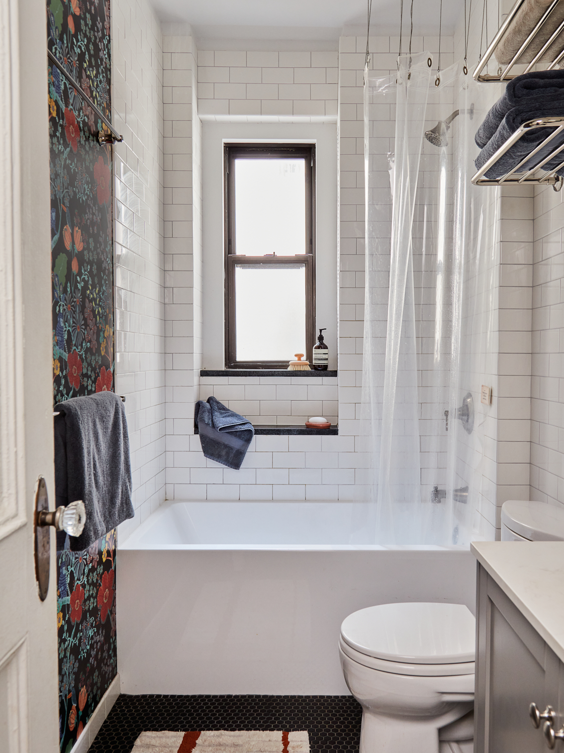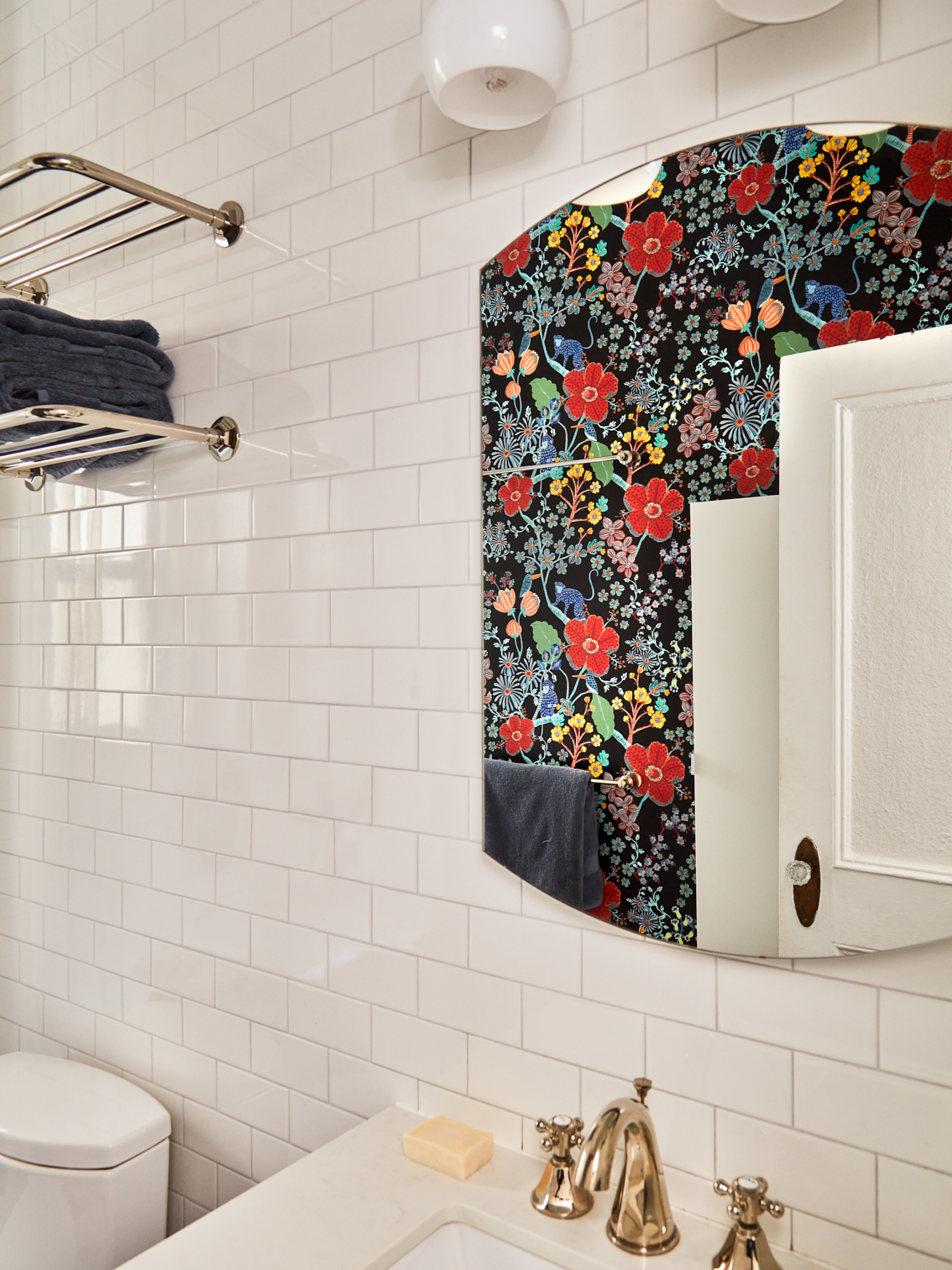 The wallpaper was all Edinger’s idea. “The tile in the space was so classic that I wanted something to give it a little more personality,” she shares. When she narrowed her swatches down to five or so samples, she had her eldest weigh in on the final pick. “She really liked the monkeys and birds,” adds Edinger.