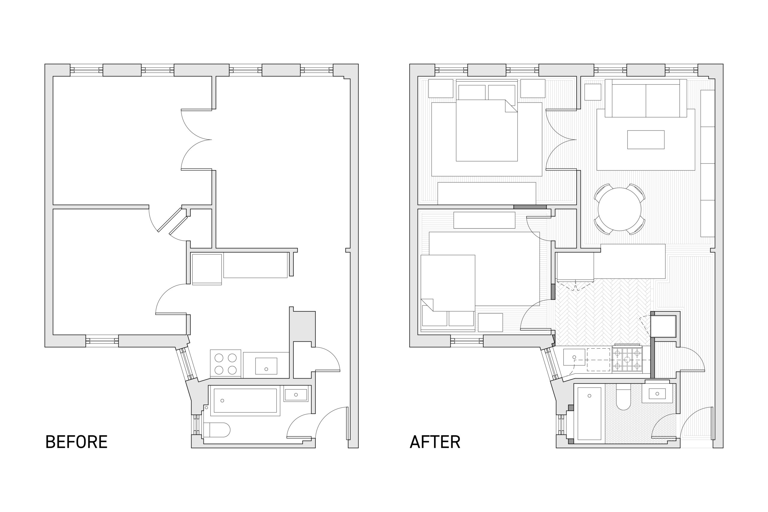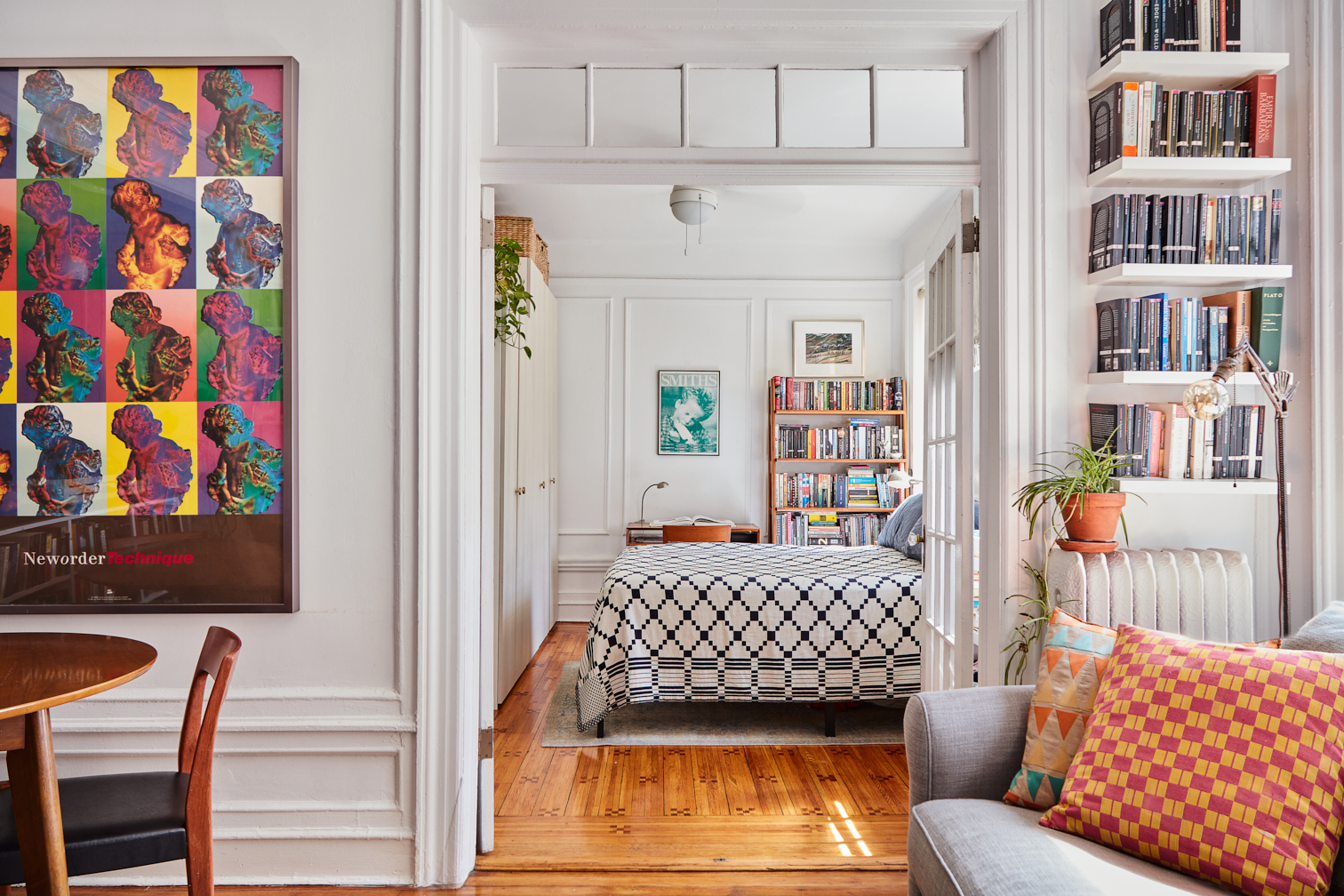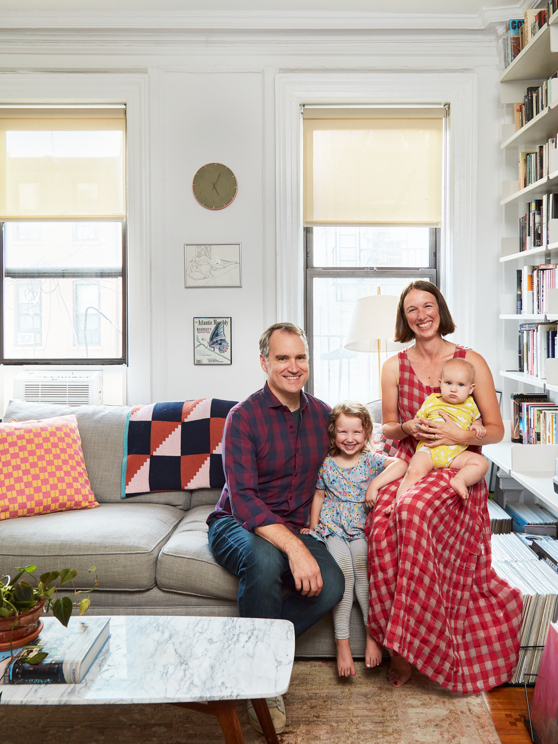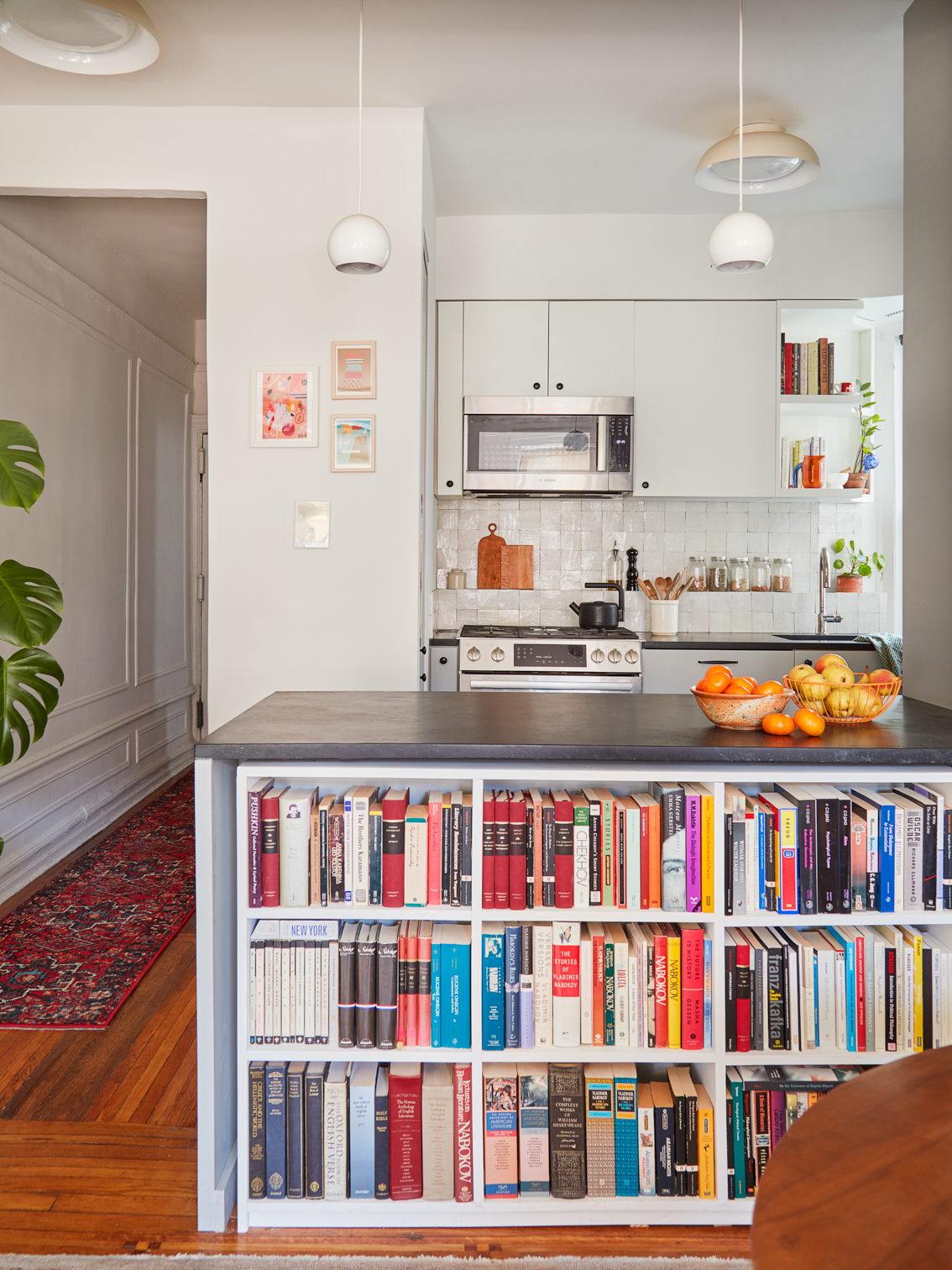 Grace Edinger and Nick Shuit knew they were meant to be when they realized they organize their books the same way: chronologically, by country. “We’re both avid readers, but Grace loves checking things out. I like to own them,” says Shuit. The couple’s collection is so big now, almost anytime a friend comes over to the Prospect Park, Brooklyn, apartment they share with their two kids, that guest ends up leaving with a freebie (or two). But occasionally giving away titles was never going to solve the fact that the 700-square-foot home was overflowing with them. Books were stacked above doorways and piled on top of old radiator niches. So when Edinger and Shuit hired Julie Tran and Khoi Nguyen, the wife-and-husband architects behind Future Projects, to renovate the kitchen and bathroom, the designers thought strategically about where and how the family’s ever-expanding library would fit into the picture.