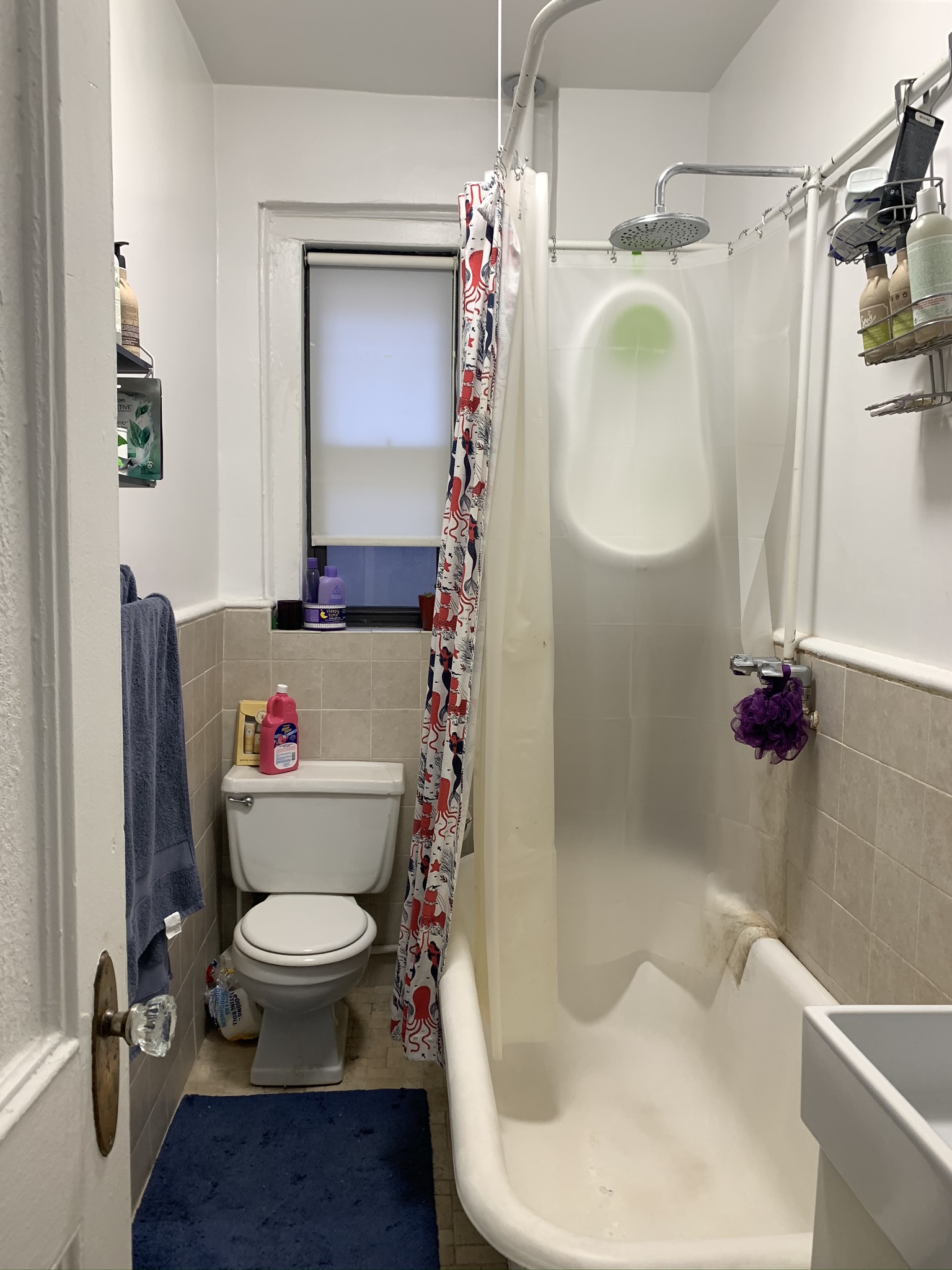 “This bathroom is smaller than your typical one,” says Nguyen. In the existing layout, the “gigantic” tub ran parallel with the wall, leaving only a sliver of space near the door for the vanity. By reorienting the shower space next to the window, they were able to offer the family of four shelves for their towels and a roomy under-the-sink cabinet.
