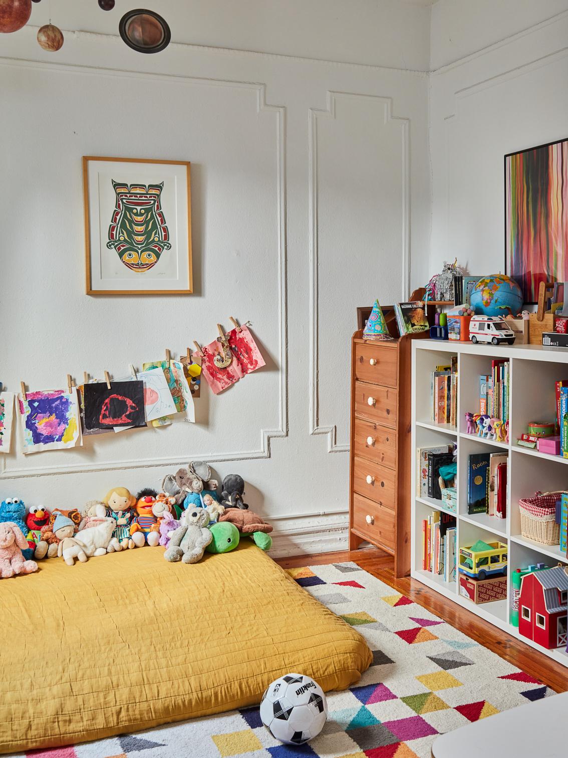 Naturally, the pair’s kids are budding bibliophiles. In their daughter’s room, a cushy floor bed sets her up for ultimate independence (“She could get in and out on her own from a pretty young age,” says Edinger), and it’s a fine spot to curl up with a copy of Goodnight Moon.