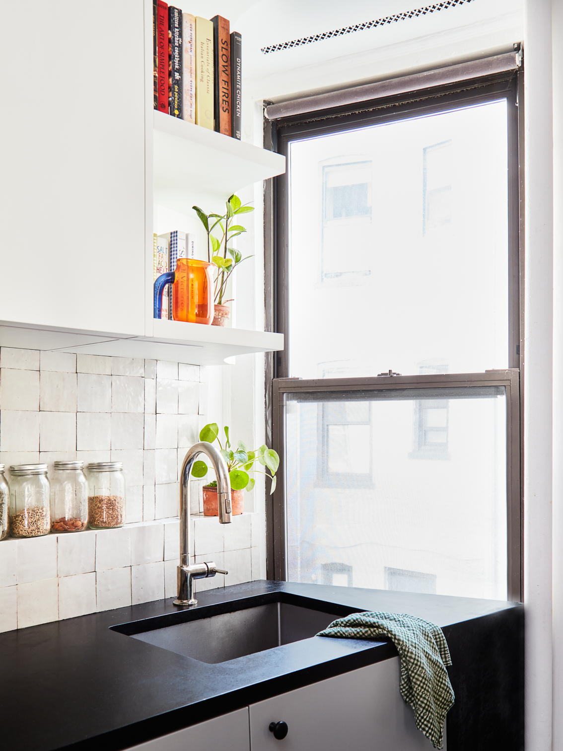 Typically, when stone shopping, you have to purchase a slab in its entirety. That’s great if you have a lot of surface area to cover, but it’s not so ideal when you need only a portion. Knowing this, Tran and Nguyen worked the leftovers from the soapstone countertop into the rest of the design. They used one of the spare pieces to create a waterfall edge by the kitchen window, while two additional offcuts top the shallow shelving niches in the bathroom.