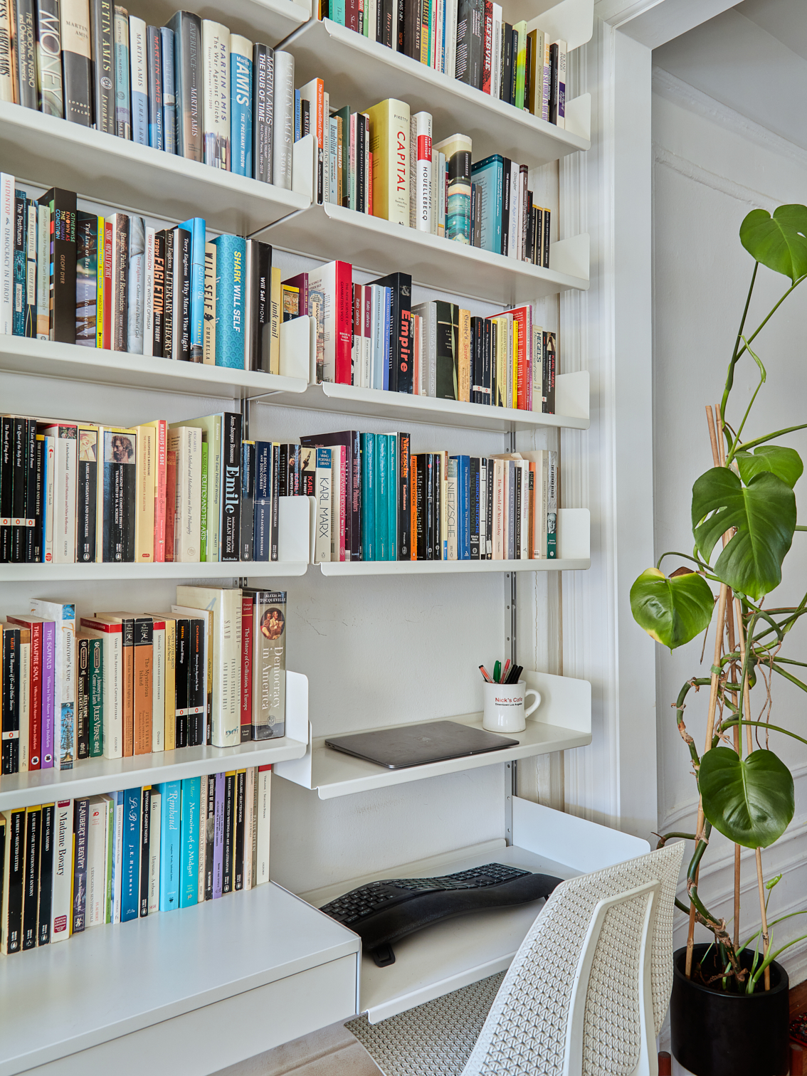 When Shuit and Edinger moved to Brooklyn from Manhattan’s East Village neighborhood back in 2018, they took their IKEA Billy bookcases with them. But after a while they realized they didn’t fit the space as well. “It looked a little janky,” recalls Edinger. After researching their options, they decided to splurge on Vitsœ’s modular system, which is known for being able to hold a ton of weight and can be reconfigured almost endlessly. One such way: adding room for a desk, so that Edinger can work from home comfortably.